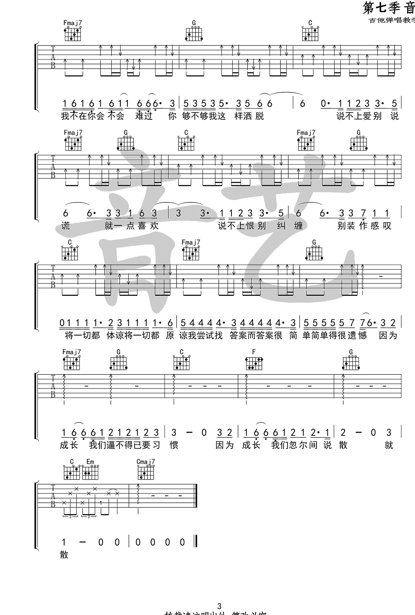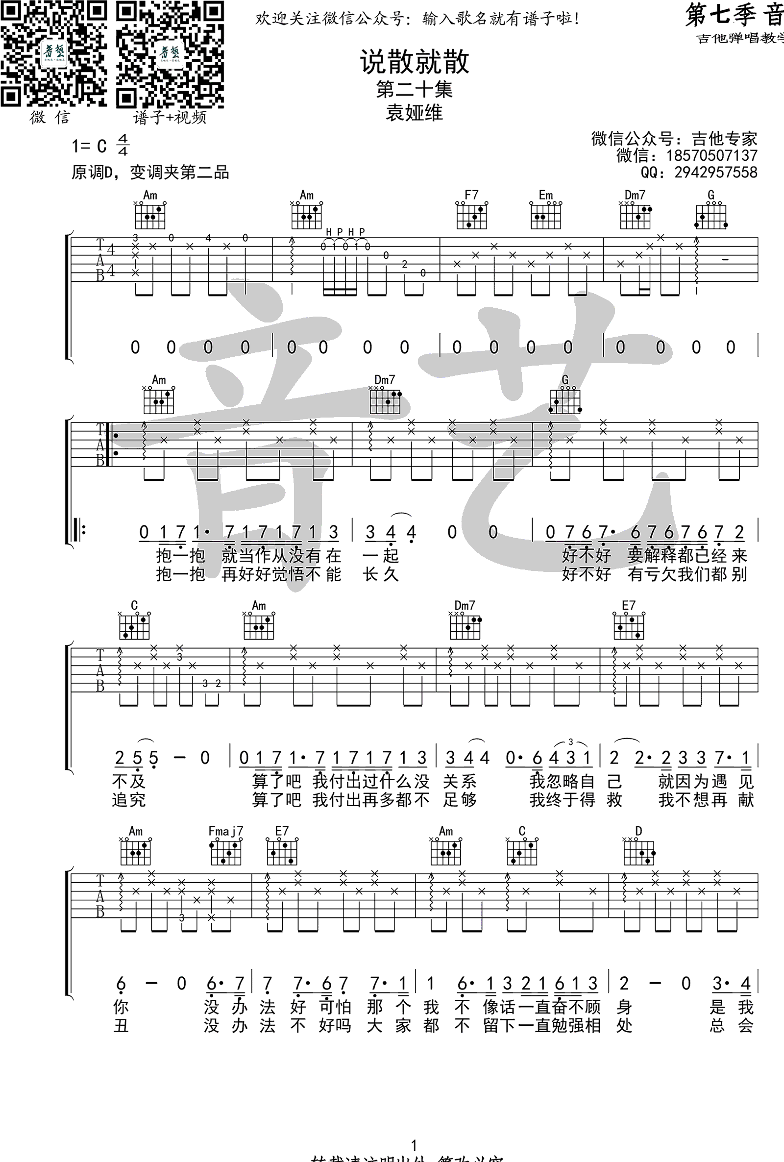 说散就散吉他谱,袁娅维倾情献唱,电影《前任3》主题曲,说散就散六线谱,高清图片谱,原调D,选用C调指法。变调夹夹2品,感谢音艺吉他的编配和提供,易唱网每日更新,欢迎收藏分享