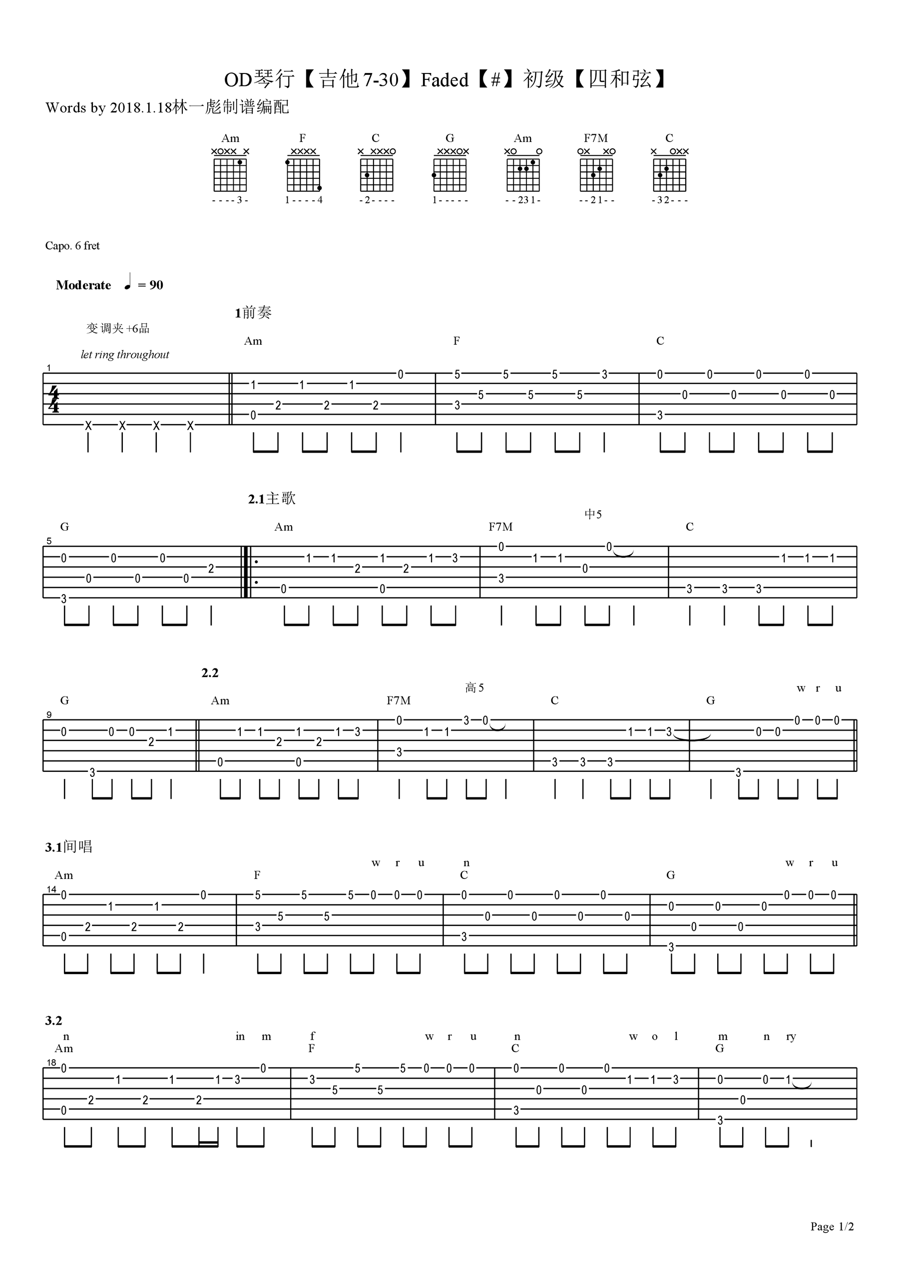 Faded吉他谱 初级版指弹谱 《Faded》吉他独奏谱 高清图片谱