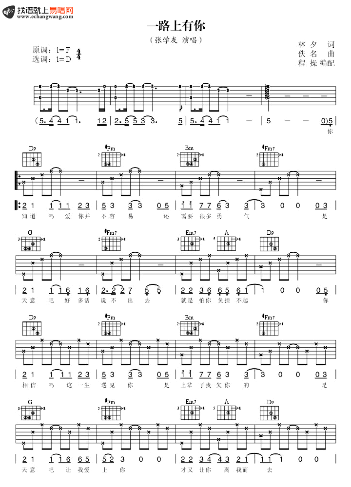 一路上有你六线谱_张学友_D调指法_吉他弹唱谱