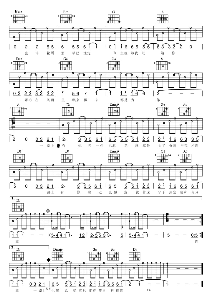 - 一路上有你六线谱_张学友_D调指法_吉他弹唱谱