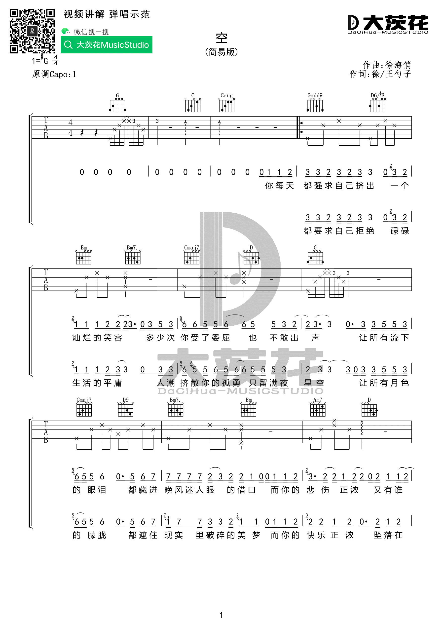 - 徐海俏《空》吉他谱_G调简单版_弹唱图片谱