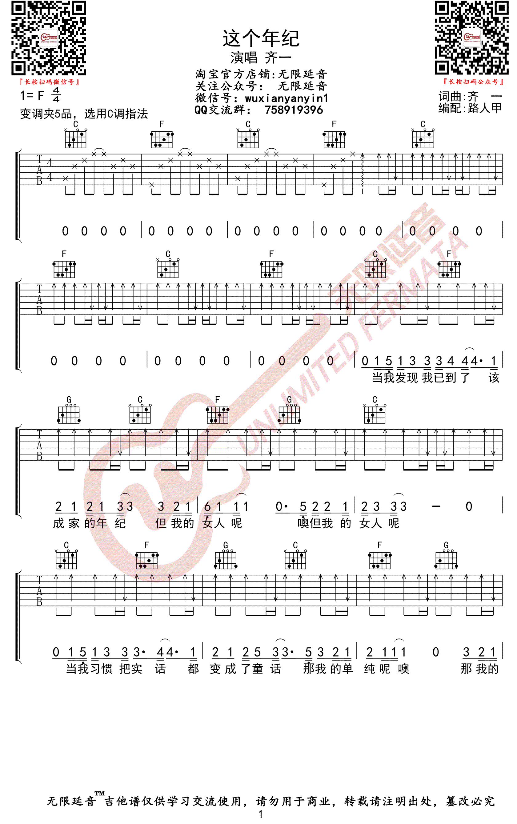 《这个年纪》吉他谱,齐一词曲原创的一首民谣歌曲,这个年纪六线谱,原调F,选用C调和弦指法,变调夹夹五品。无限延音编配制谱,易唱网整理上传。