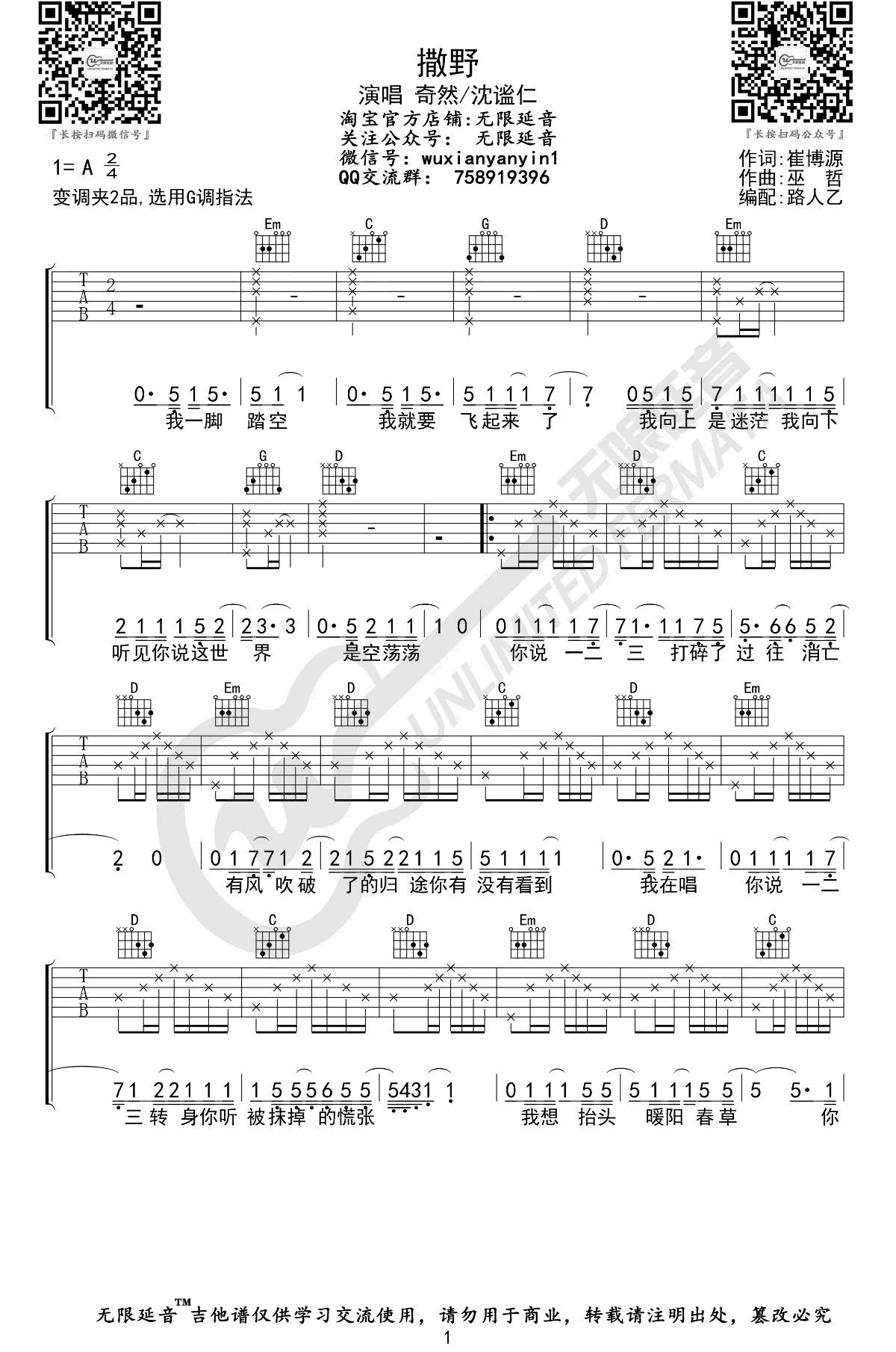 - 撒野吉他谱_奇然/沈谧仁_G调弹唱谱_巫哲小说主题曲