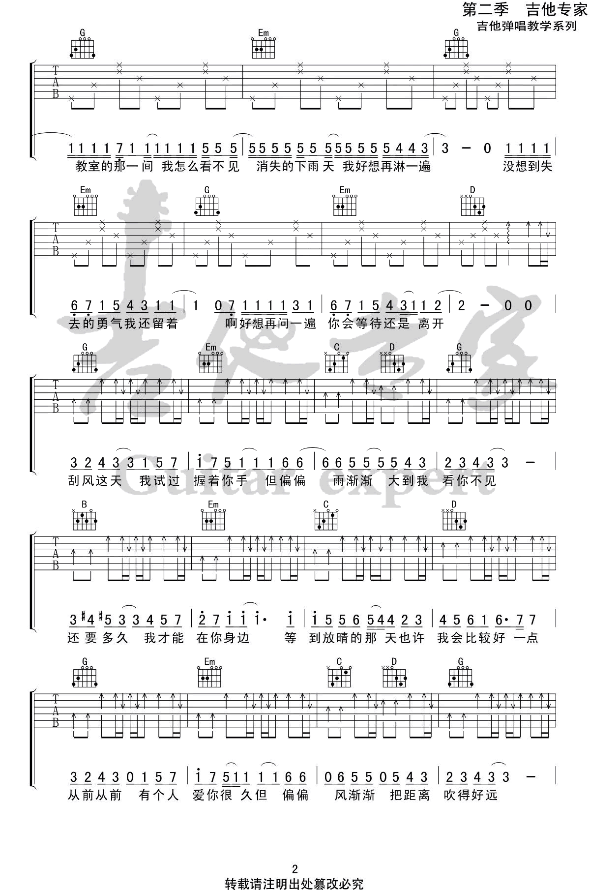 - 晴天吉他谱简单版_周杰伦_G调_弹唱六线谱