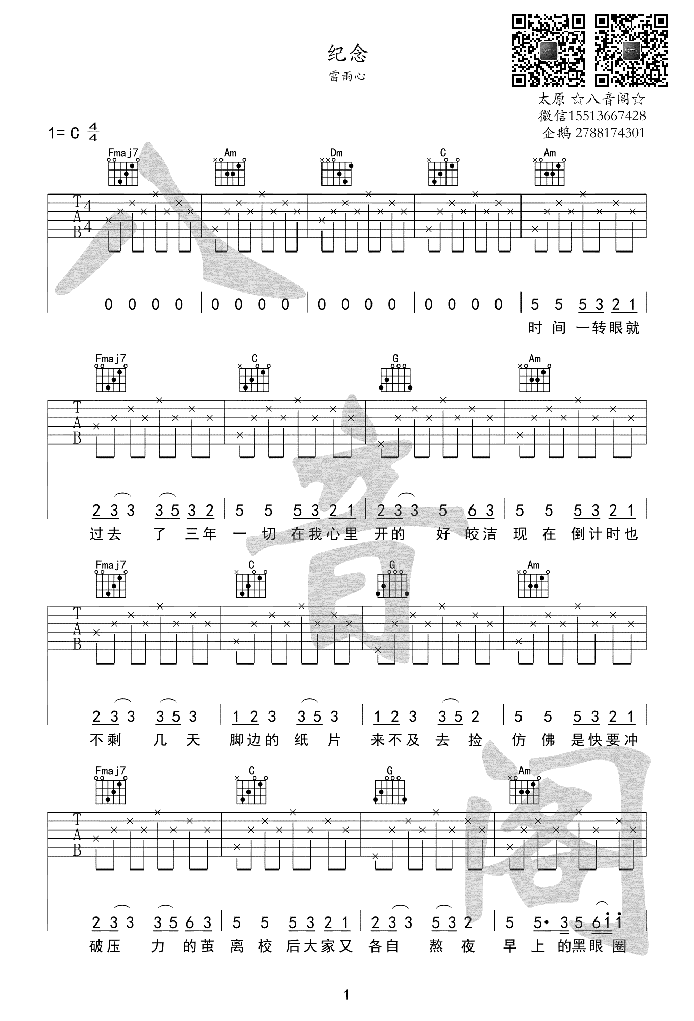雷雨心《记念》吉他谱,中国好歌曲节目的一首原创歌曲,记念六线谱,C调和弦弹唱谱,两张高清图片谱,八音阁编配分享,并送上曲谱配套吉他弹唱示范视频,易唱网整理分享。
