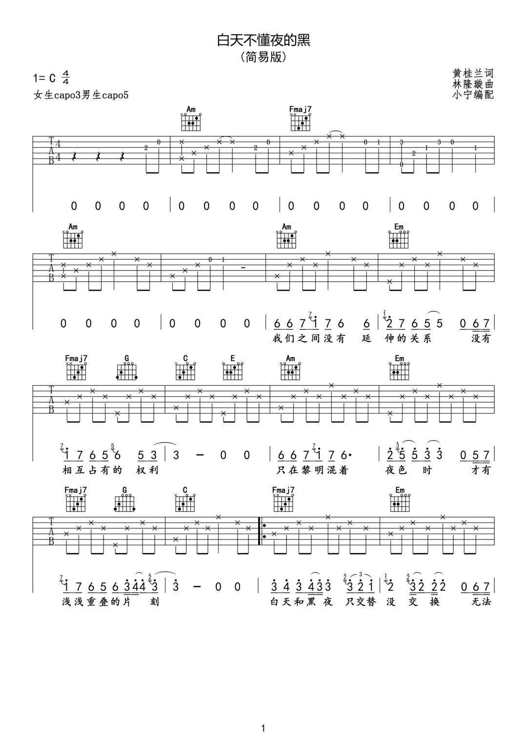 - 白天不懂夜的黑吉他谱_那英_C调简易版_弹唱六线谱