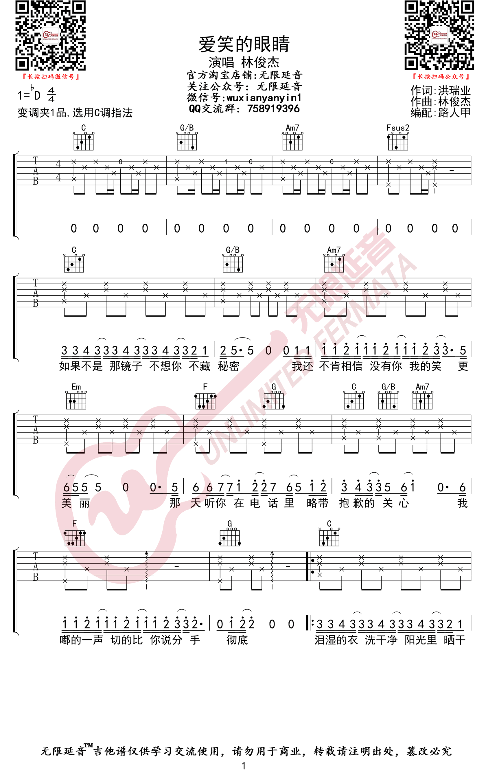 林俊杰《爱笑的眼睛》吉他谱,原调bD,变调夹夹第四品,选用C调指法。爱笑的眼睛六线谱,三张弹唱图片谱。无限延音编配制谱,易唱网上传分享。