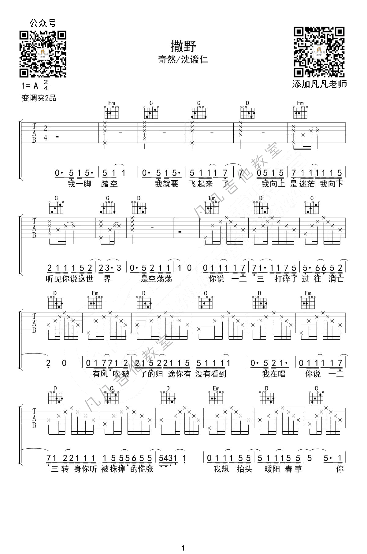 《撒野》吉他谱,奇然沈谧仁演唱版本,这首歌曲是根据巫哲小说改编的网络广播剧主题曲,撒野吉他六线谱,A调,需要变调夹夹2品。两张图片谱易唱网上传,凡凡吉他编配出品并同步吉他演示视频。。整首歌曲和弦较为简单,扫弦节奏实际不难,大家不要惧怕32分音符,由于歌曲速度不快,扫弦实际很easy。难点在于唱和弹的配合、一定要对唱的节奏很熟悉,才能更好融进弹。琴友们可以根据自己的音域使用变调夹。