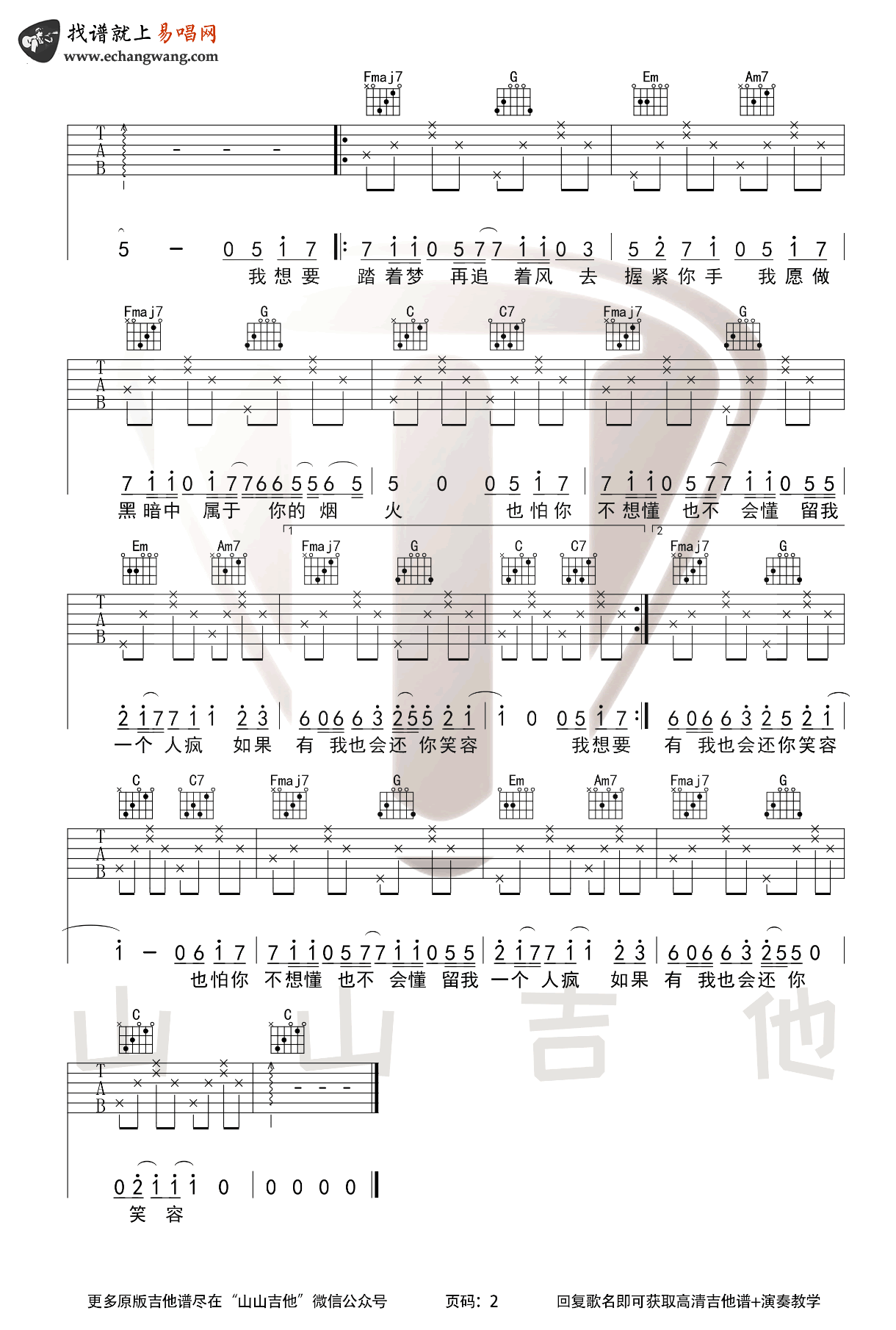 《欢》吉他谱,苏琛词曲演唱的一首网络热门歌曲,欢吉他弹唱谱,C调编配,两张图片六线谱。随谱附上吉他弹唱视频,易唱网感谢山山吉他出品分享。追着风踏着梦去紧握你的手,黑暗中做属于你的烟火。歌声真挚,吉他伴奏下的旋律带着伤感,听得让人心疼。喜欢这首歌曲的琴友们,可以跟随老师的弹唱演示视频练习起来。