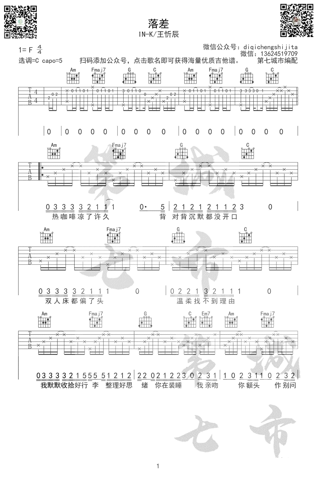- IN-K王忻辰《落差》吉他谱_C调_弹唱六线谱