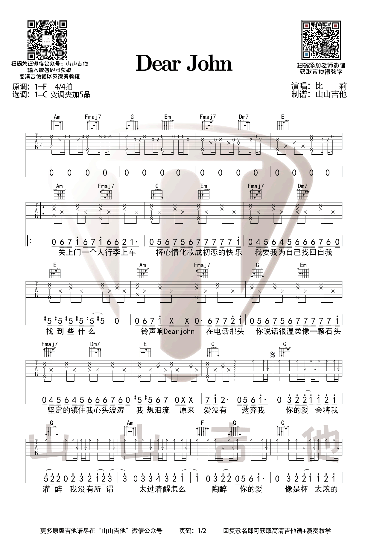 - 《Dear John》吉他谱_比莉(王雪娥)_C调_弹唱六线谱