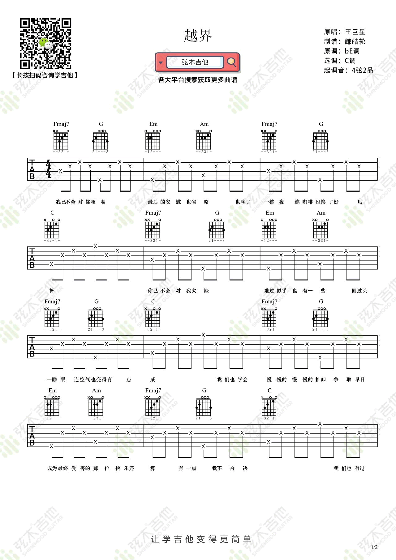 - 越界吉他谱_王巨星_C调弹唱谱_简单版