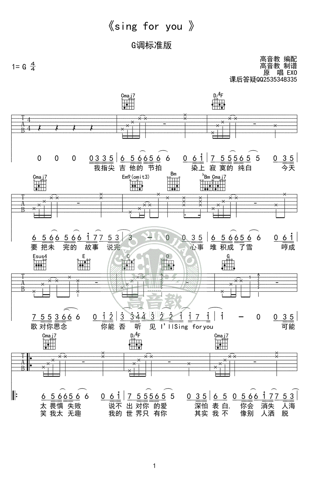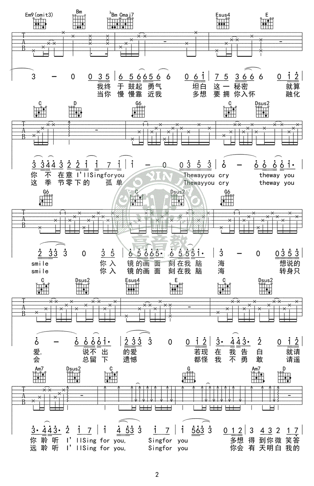 Sing For You (为你而唱)歌词 作词:Kenzie 作词(中文):周炜杰 作曲:Matthew Tishler / Felicia Barton / Aaron Benward 编曲:Kenzie 演唱:EXO 我指尖吉他的节拍 染上寂寞的纯白 今天要把未完的故事说完 心事堆积成了雪 哼成歌对你思念 你能否听见 I’ll Sing for you 可能太畏惧失败 说不出对你的爱 深怕表白, 你会消失人海 我终于鼓起勇气 坦白这一秘密 就算你不在意 I’ll Sing for you The way you cry, the way you smile 你入镜的画面刻在我脑海 想说的爱, 说不出的爱 若现在我告白 就请你聆听 I’ll Sing for you, Sing for you 多想得到你微笑答案 请别笑我太无趣 我的世界只有你 其实我不像别人洒脱 当你慢慢靠近我 多想要拥你入怀 融化这季节 零下的孤单 The way you cry, the way you smile 你入镜的画面刻在我脑海 转身只会总留下遗憾 都怪我不勇敢 请遥远聆听 I’ll Sing for you, Sing for you 你会有天明白我的爱 感谢命运的奇迹 引我来遇见你 你是我最美奇迹 可能在今夜后 我又变成懦弱的我 所以今天一定要对你说出口 请用心去聆听 The way you cry, the way you smile 你入镜的画面 刻在我脑海 想说的爱, 说不出的爱 若现在说出来 这一刻对你说 只想你聆听 I’ll Sing for you, Sing for you 只想你聆听 I’ll Sing for you