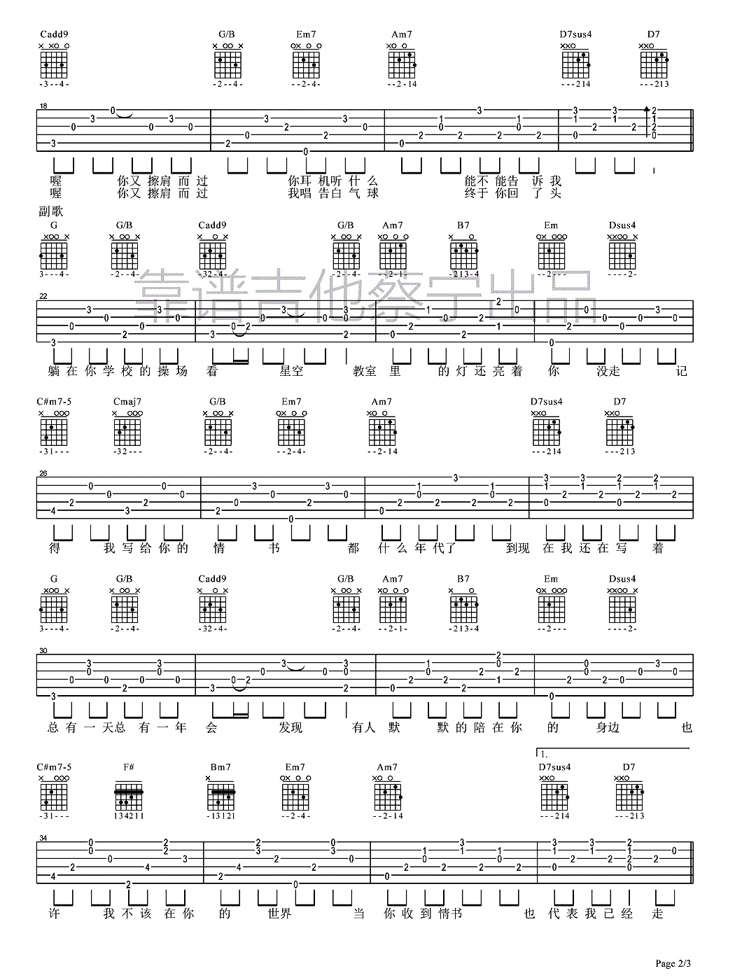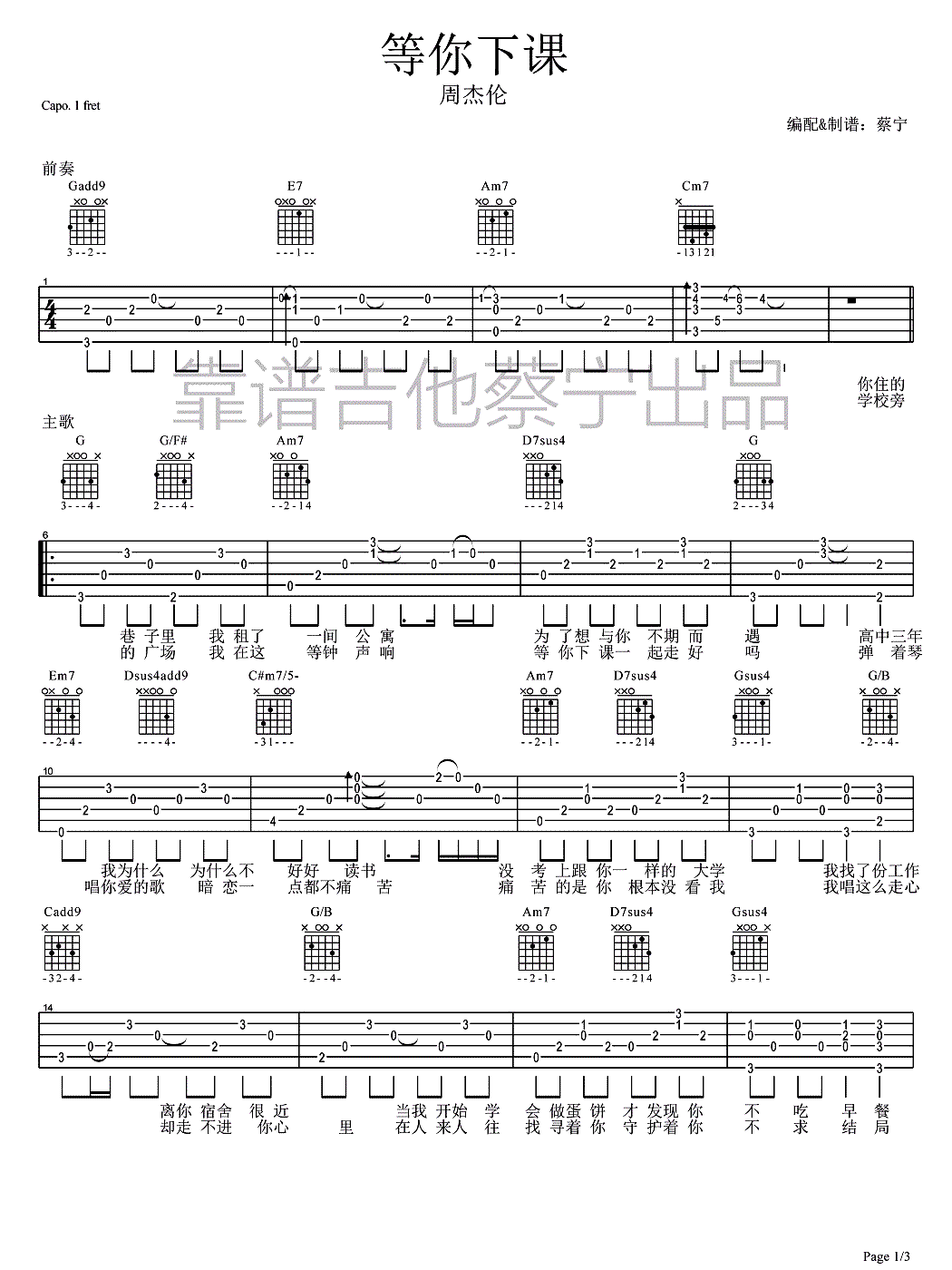 - 周杰伦 等你下课吉他谱 G调弹唱谱 高清六线谱