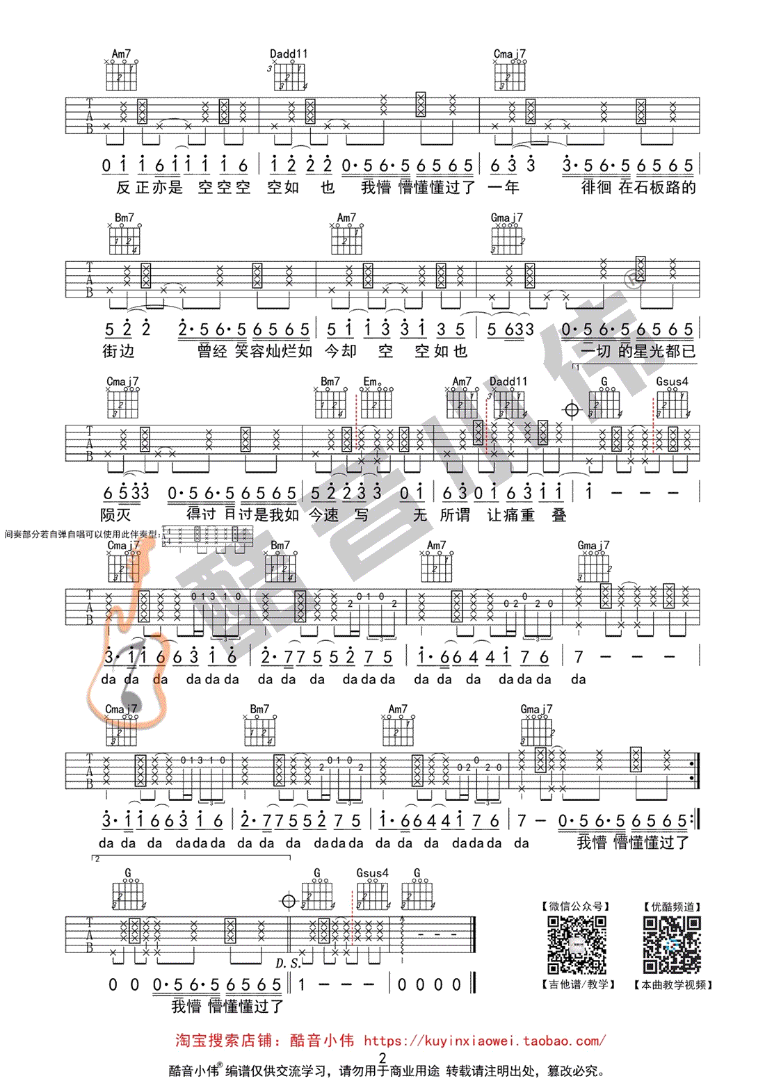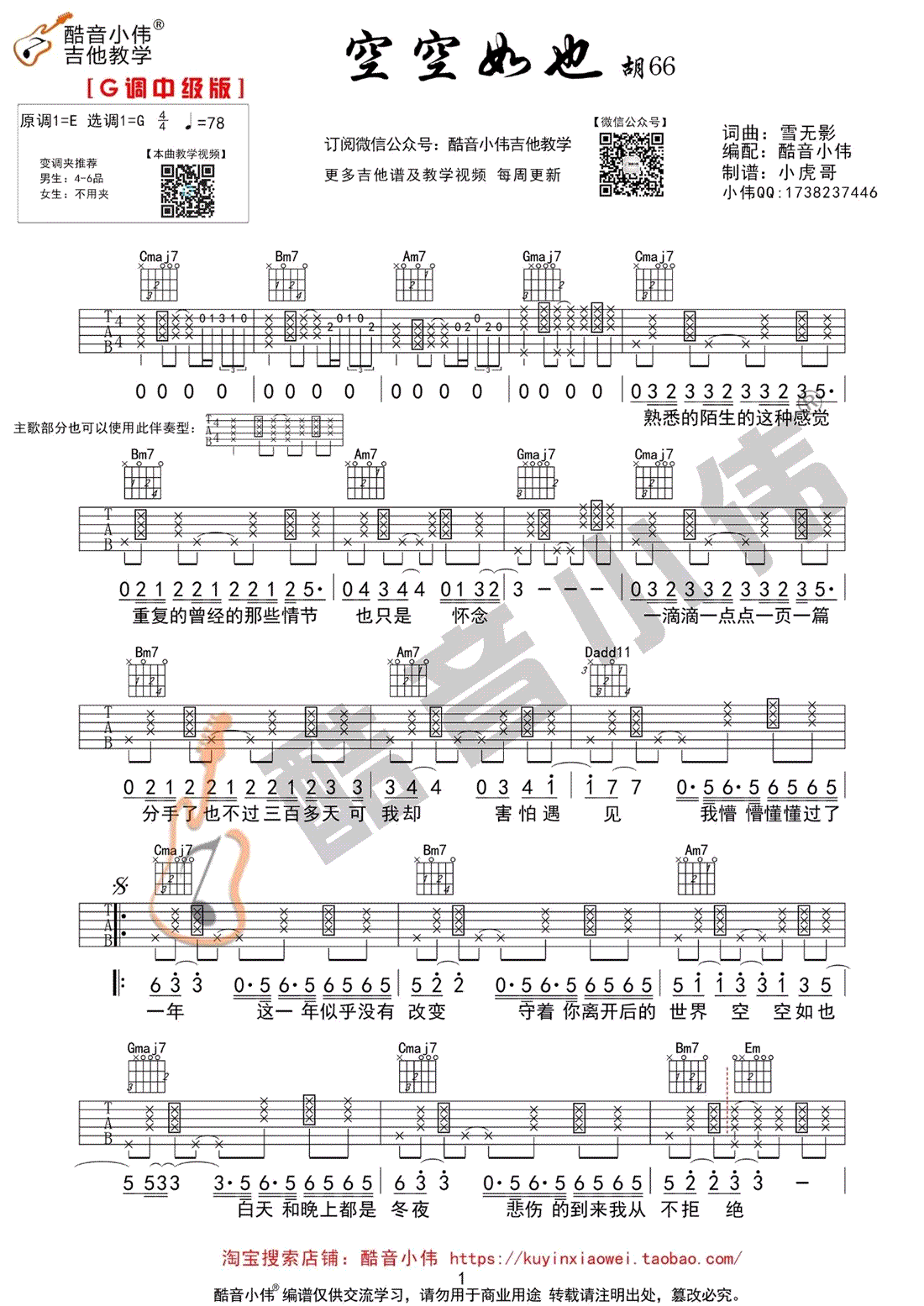 - 胡66 空空如也吉他谱 G调简单版 高清图片谱