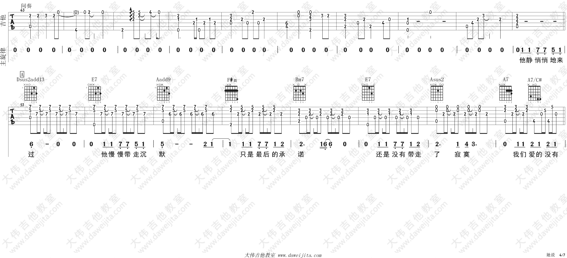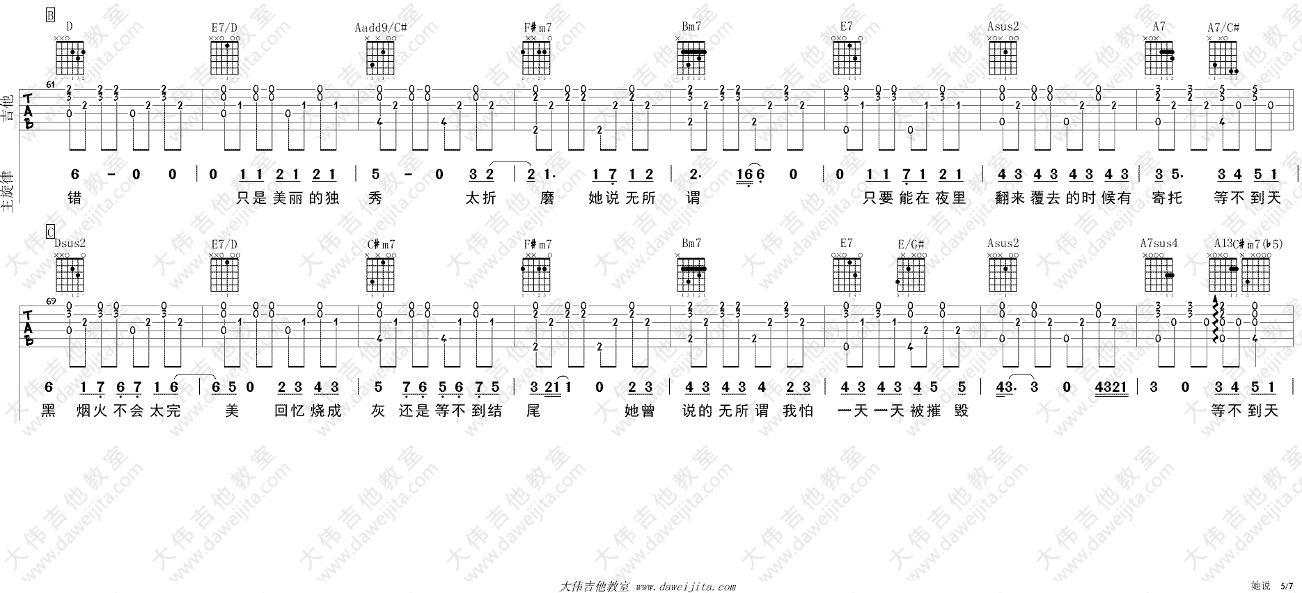 她说吉他谱,林俊杰演唱,《她说》吉他弹唱谱,男声调曲谱,指法音高A,变调夹夹第2品,女生推荐变调夹夹4品,七张高清图片谱子,感谢大伟吉他的编配和提供的弹唱演示,易唱网推荐分享。