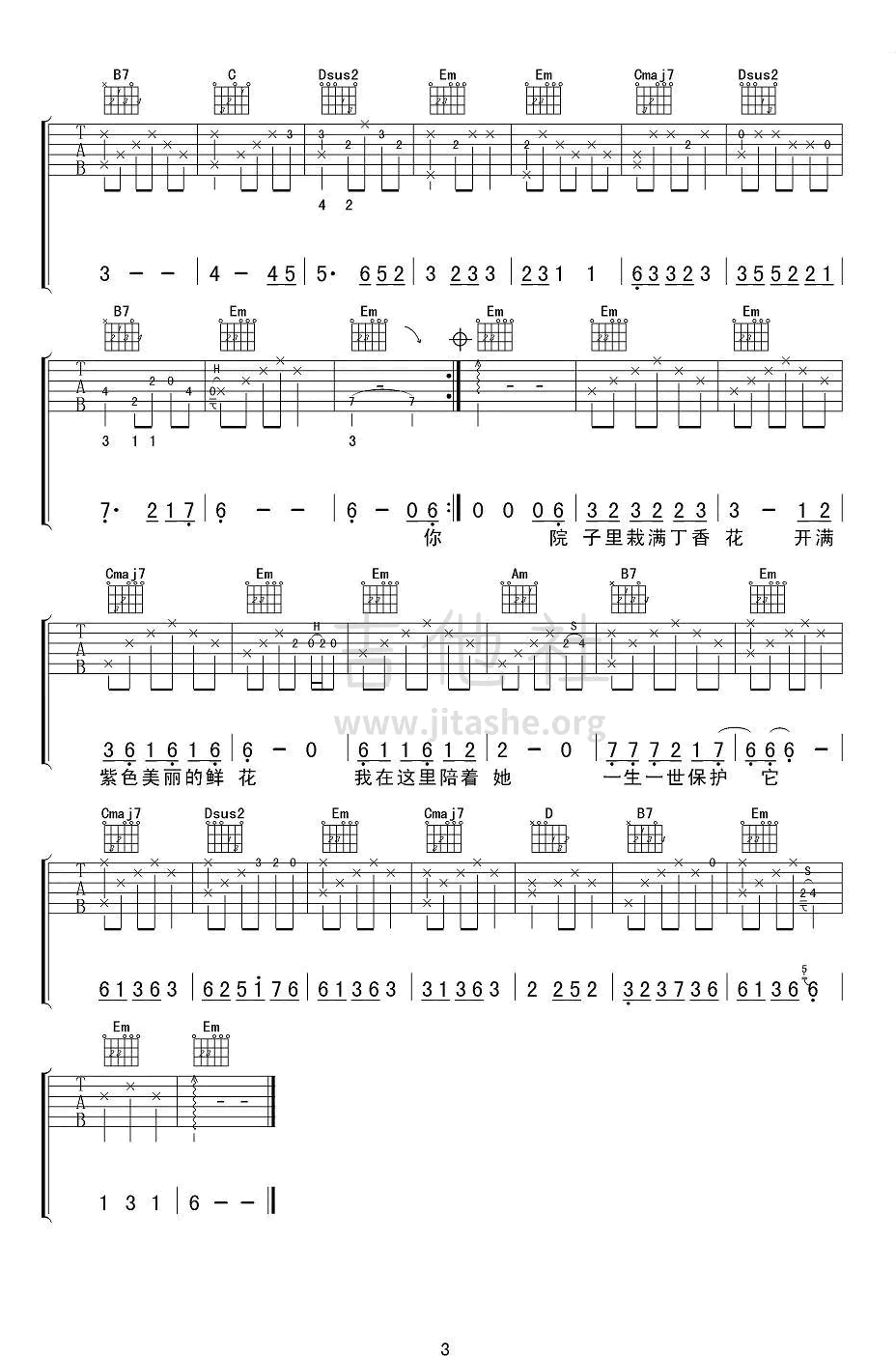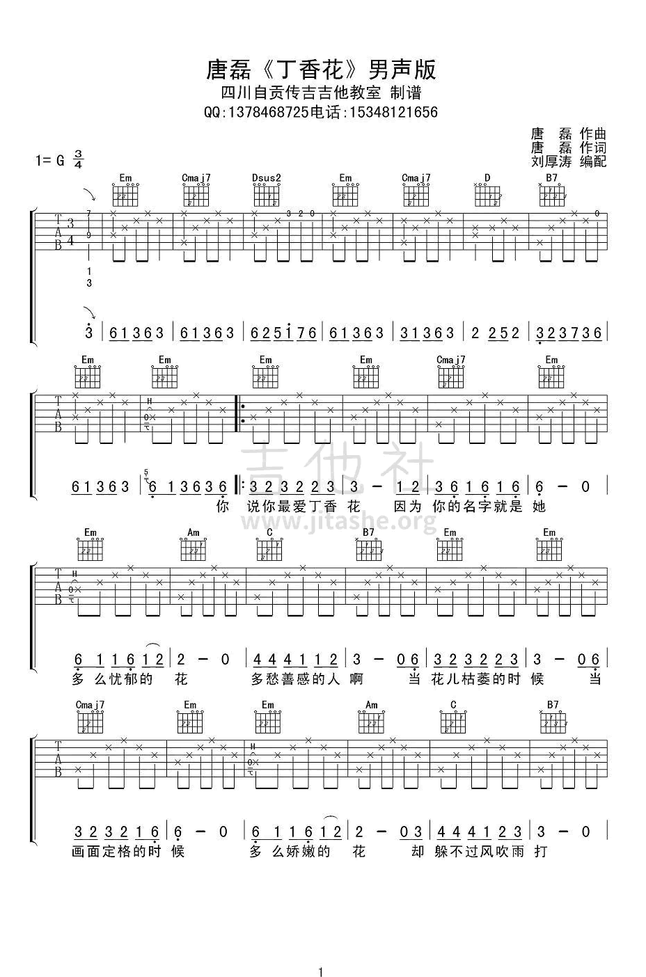 唐磊《丁香花》吉他谱,六线谱共三张图片,选用G调指法编配,一首经典的吉他弹唱歌曲,丁香花男生版弹唱谱,感谢刘厚涛编配制谱,易唱网更新上传。