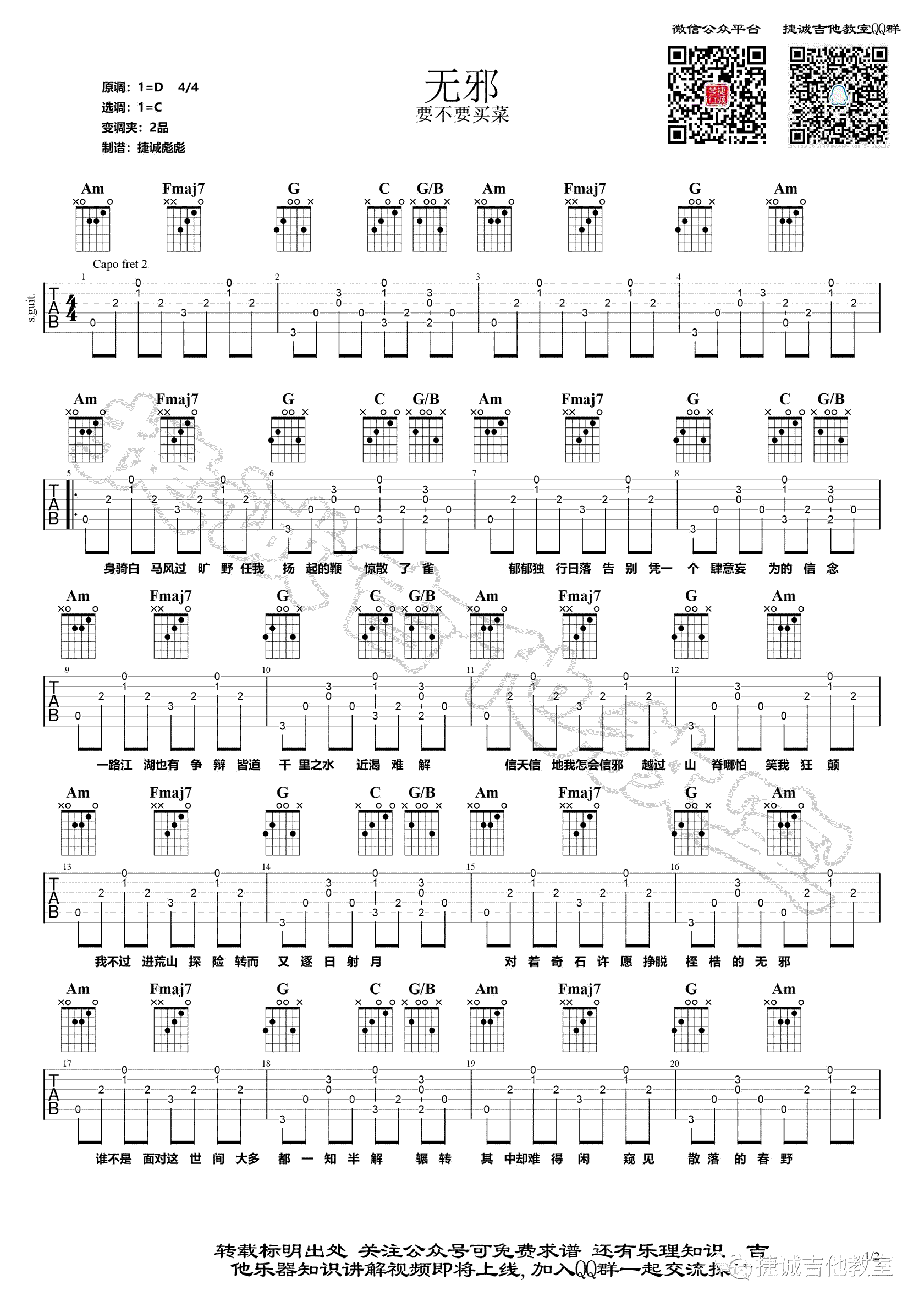- 无邪吉他谱_要不要买菜_C调_弹唱六线谱