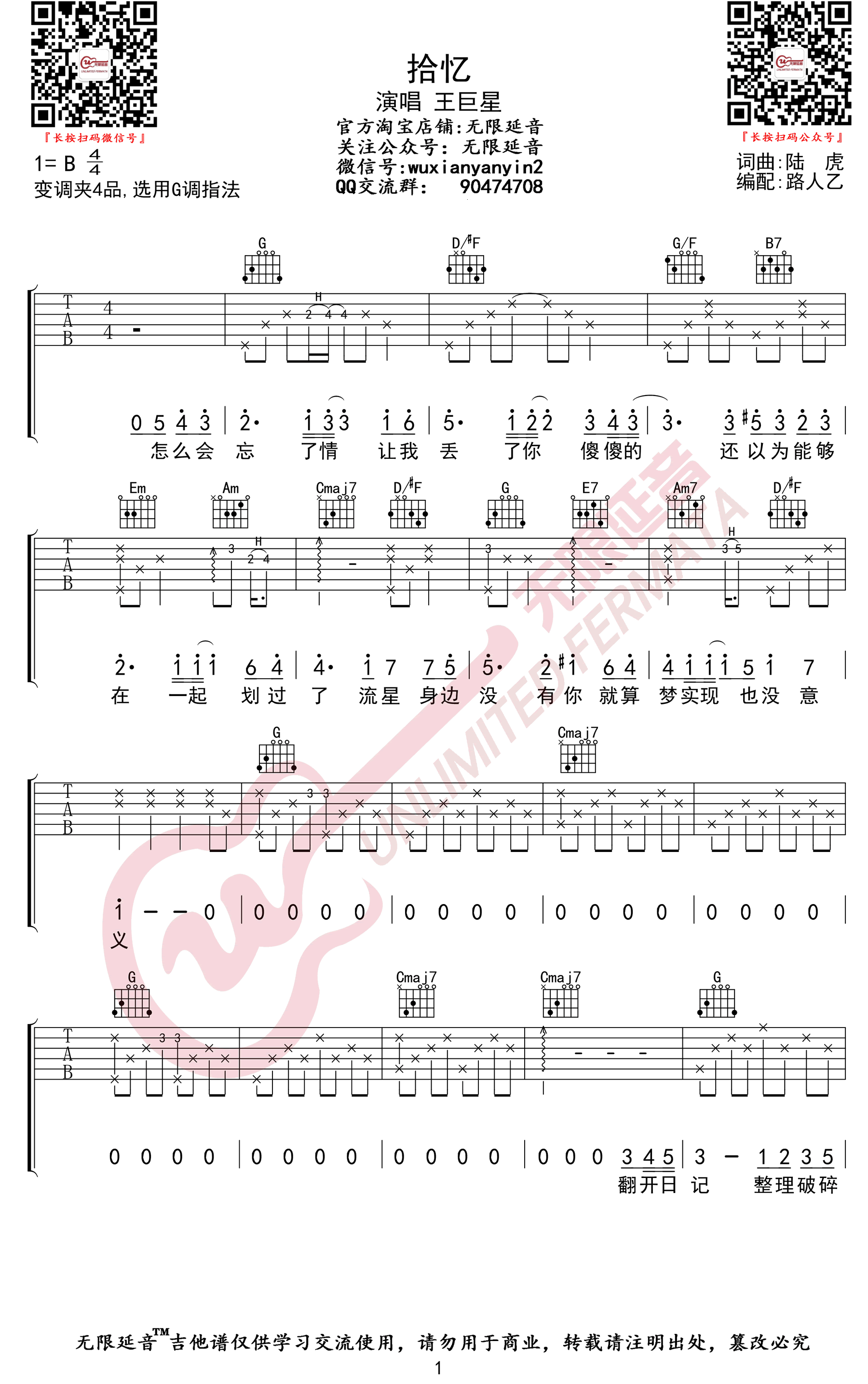 - 王巨星《拾忆》吉他谱_G调弹唱谱_一起去看流星雨插曲