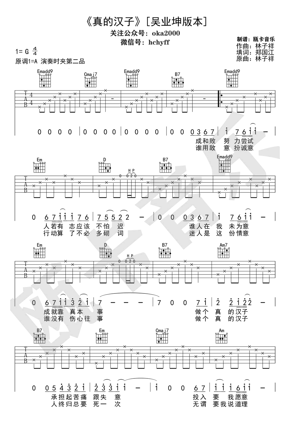 真的汉子吉他谱,吴业坤版本,林子祥原唱的一首经典粤语歌曲。真的汉子六线谱,原调A选调G,演奏时变调夹夹第二品。弹唱图片谱由瓯卡音乐编配,易唱网整理上传。