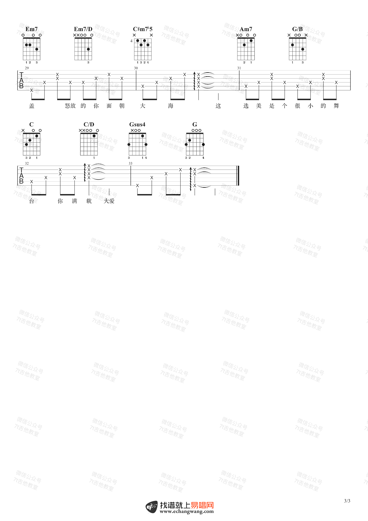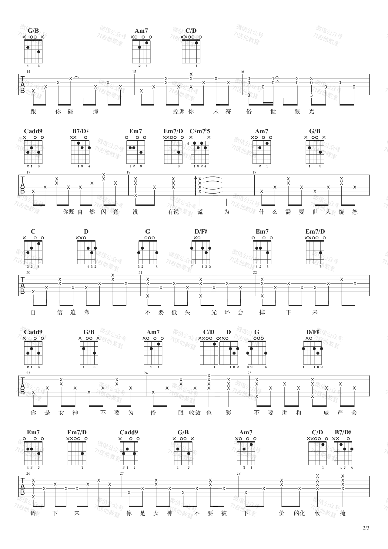女神吉他谱,郑欣宜演唱的一首粤语歌曲。女神吉他弹唱谱,歌曲原调是F大调,采用G大调的指法来编配,随谱附上吉他弹唱演示,视频里是标准音调弦,没有用变调夹。如果想弹原调,需要降全音调弦。感谢7T吉他教室编配,易唱网上传更新。和弦分析:首先讲一下比较基本的,把一些三和弦丰富一下,二级、六级用了小七;四级用了add9;五级用了4/5……这首歌用了很多斜杠和弦的用法,大体框架类似卡农的和弦走向,并稍有变化,1 → 5/7 → 6m → 6m/5 → 4 → 1/3 → 2m → 5 可以发现低音部分是1765432的音阶下行,许多流行歌都会用这个套路,这首歌也是一个例子。「没有说谎……」还有「怒放的你面朝大海」这两句 Em7 → Em7/D → C#m7-5 ,这种升四级半减七很多首歌都有出现这个用法,必需学会呀!有几处Em7的前面用了B7/D#来过渡,这个是副属和弦的常见用法,平时在歌曲里也出现比较多,建议掌握!
