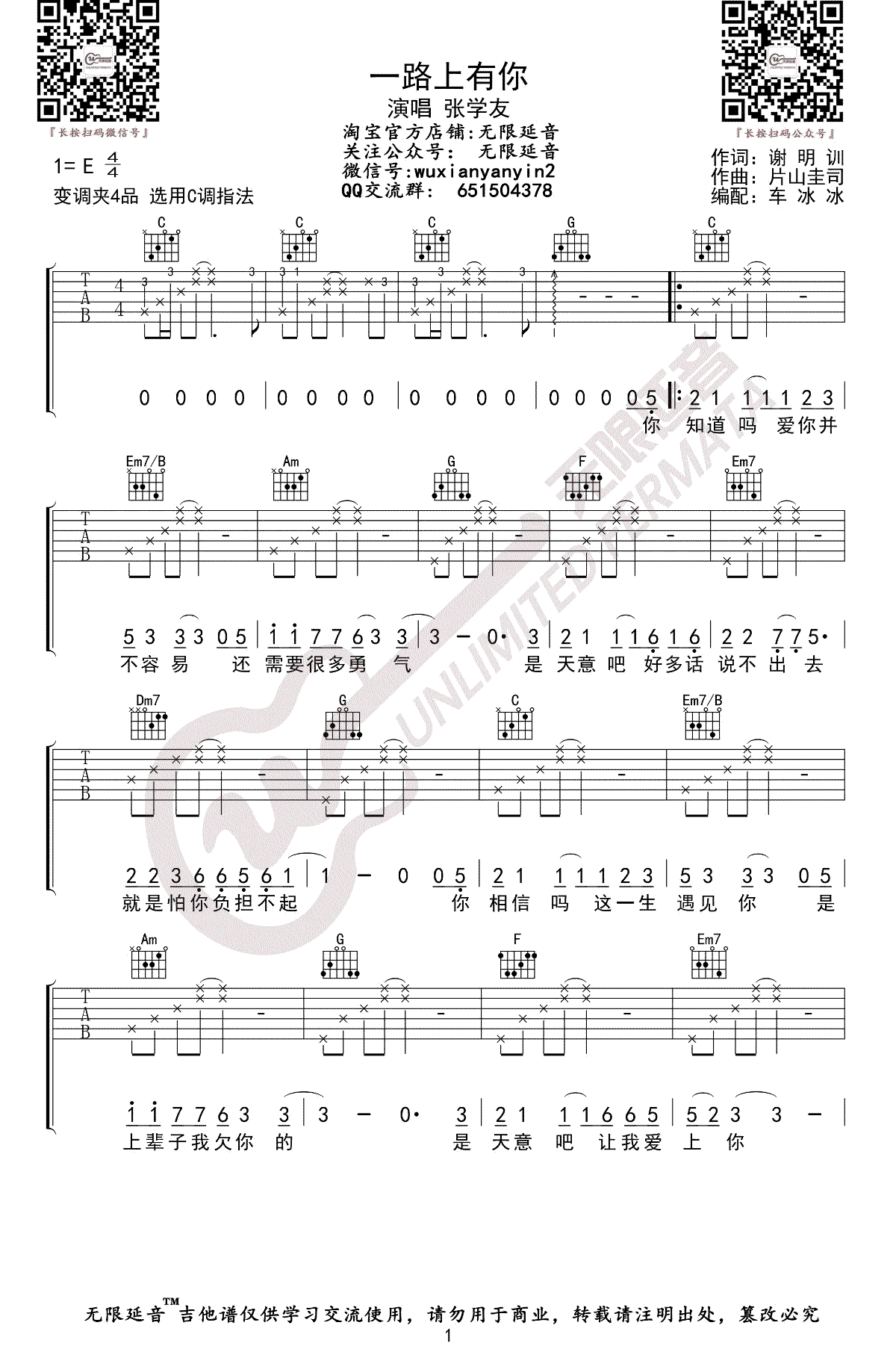 - 一路上有你吉他谱_张学友_C调_弹唱六线谱