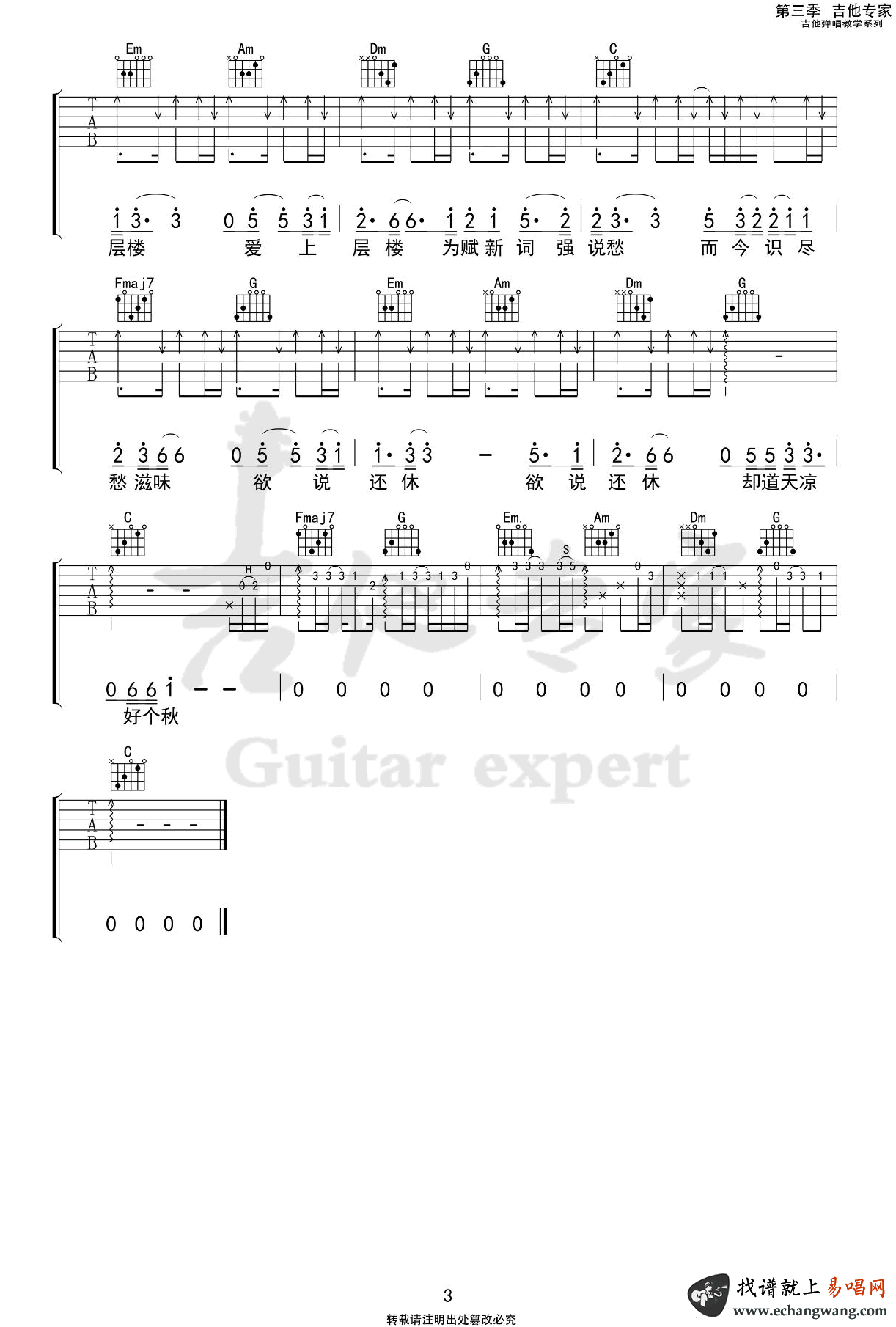 - 三号线吉他谱_刘大壮_C调弹唱谱_完整版六线谱
