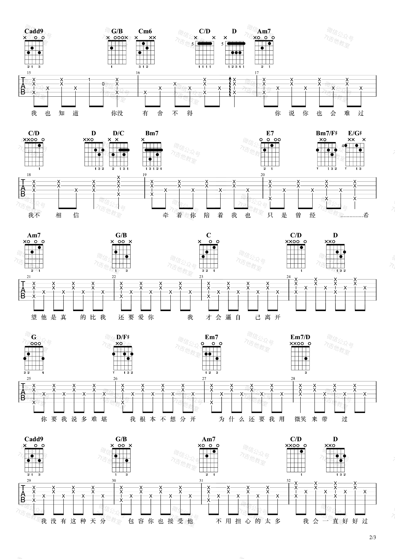 7T吉他教室编配说明:首先讲一下比较基本的,把一些三和弦丰富一下,二级、三级、六级用了小七;四级用了add9;五级用了4/5……