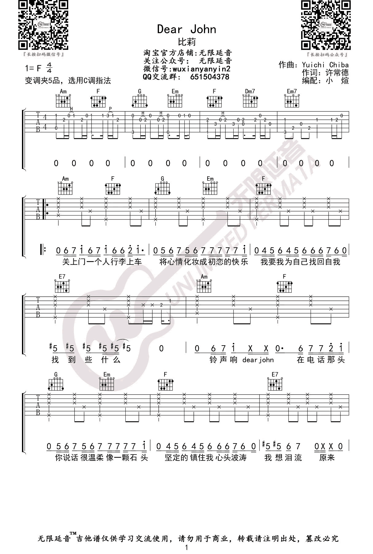 - 《Dear John》吉他谱_比莉(王雪娥)_C调_弹唱六线谱