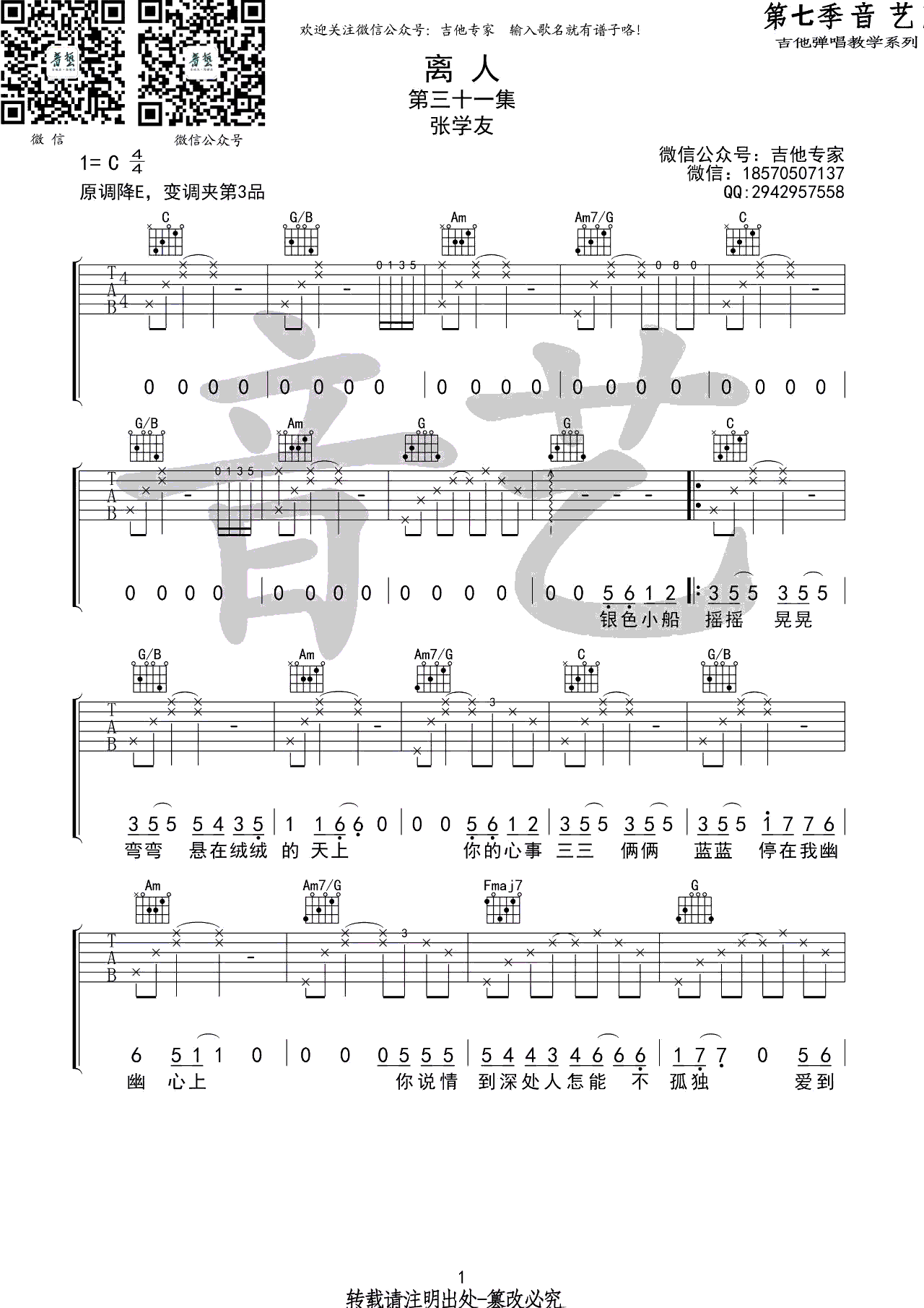 - 离人吉他谱 张学友 C调和弦编配 《离人》弹唱谱
