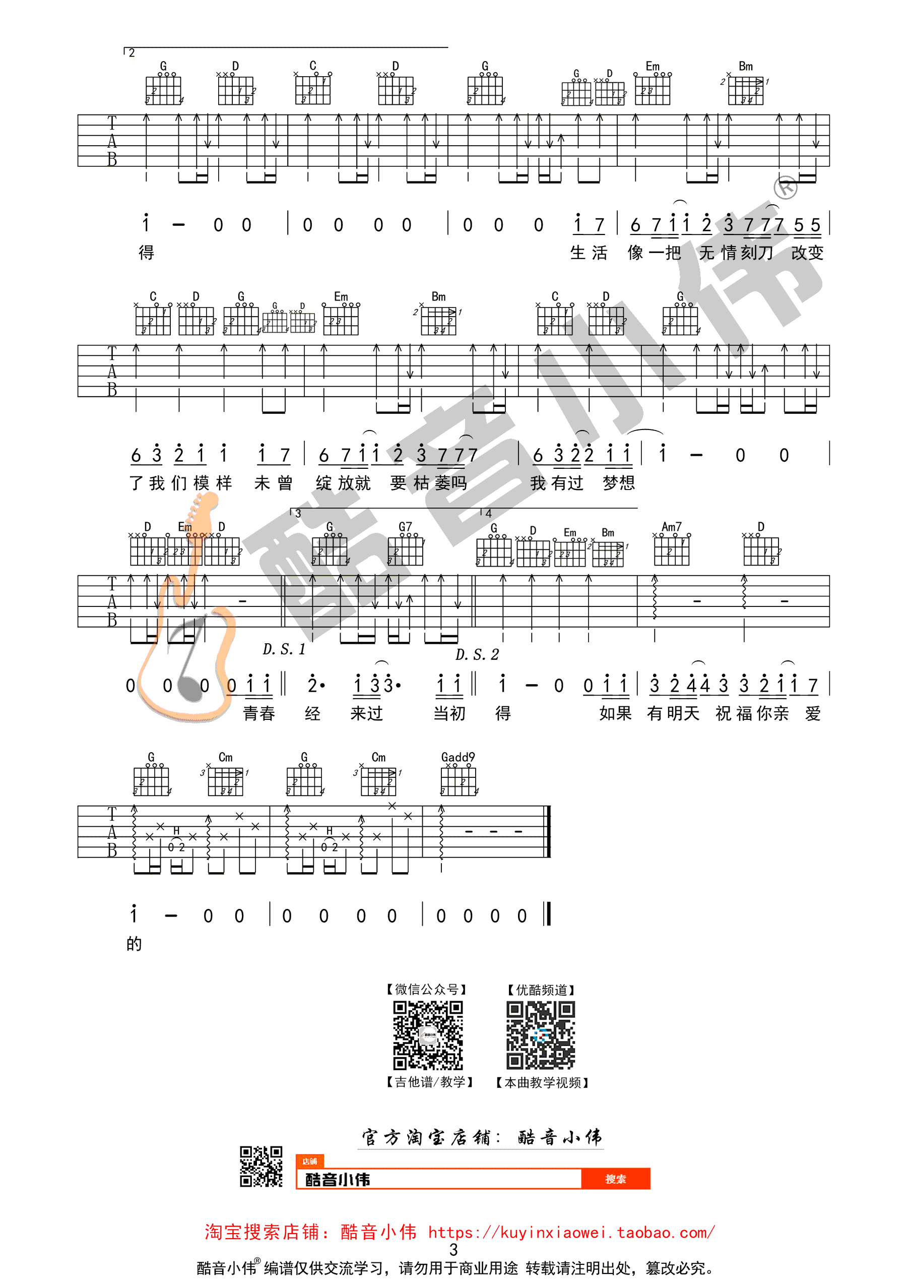 老男孩吉他谱 G调弹唱谱 筷子兄弟《老男孩》吉他教学视频