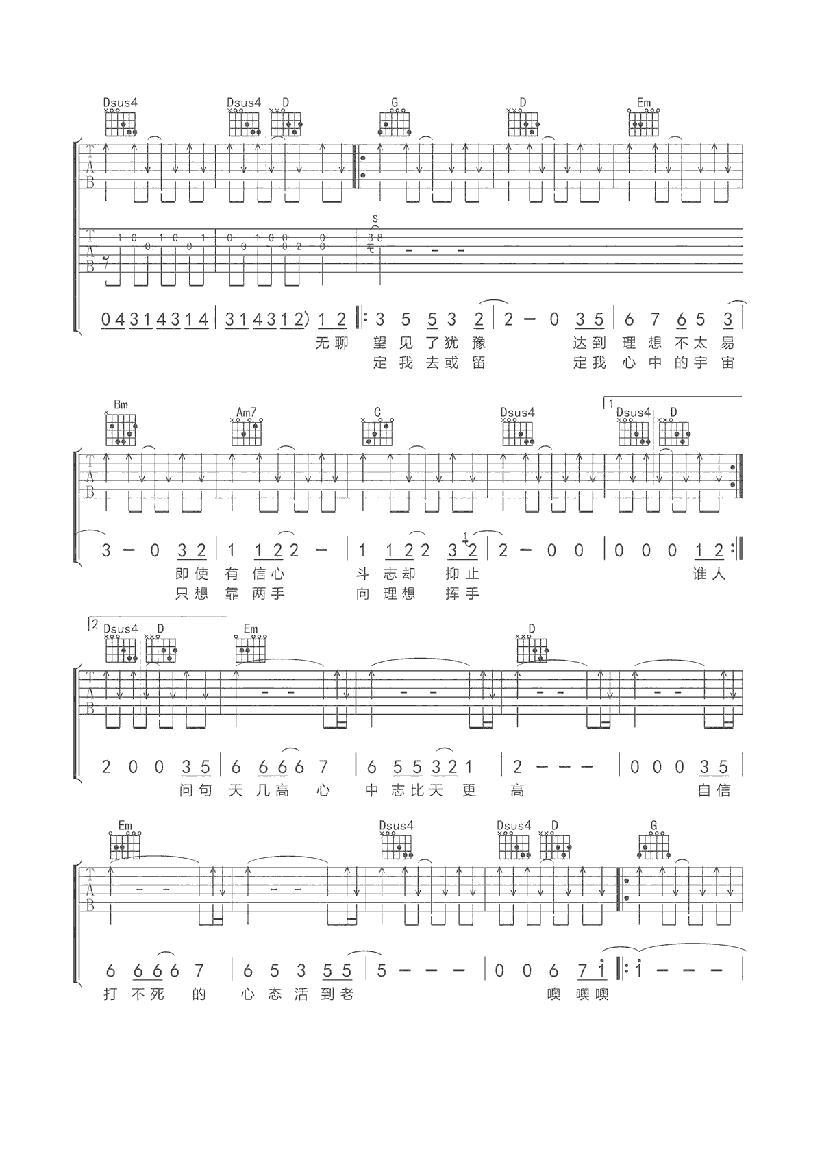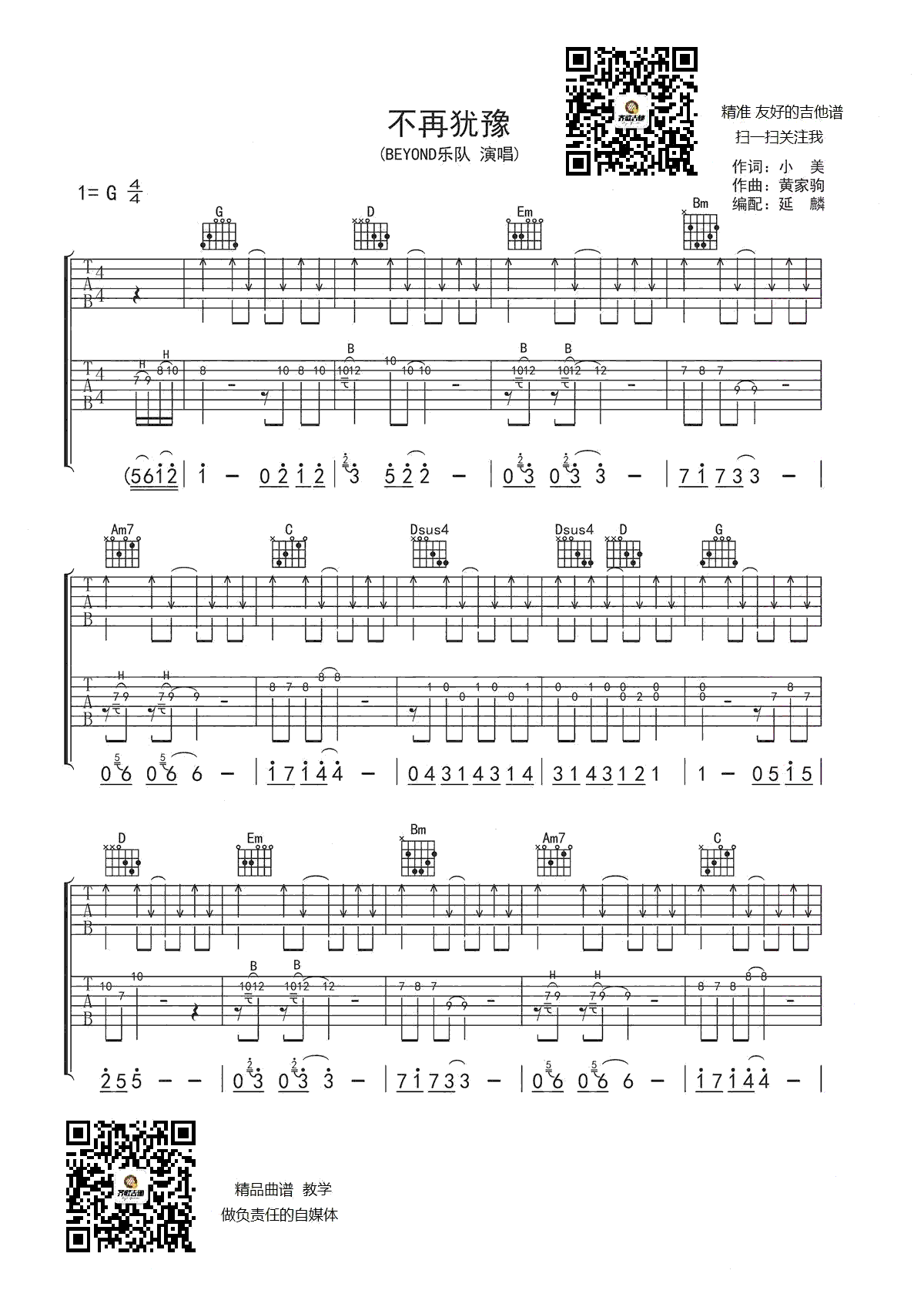 不再犹豫吉他谱 Beyond 双吉他版本 G调弹唱谱 高清图片谱