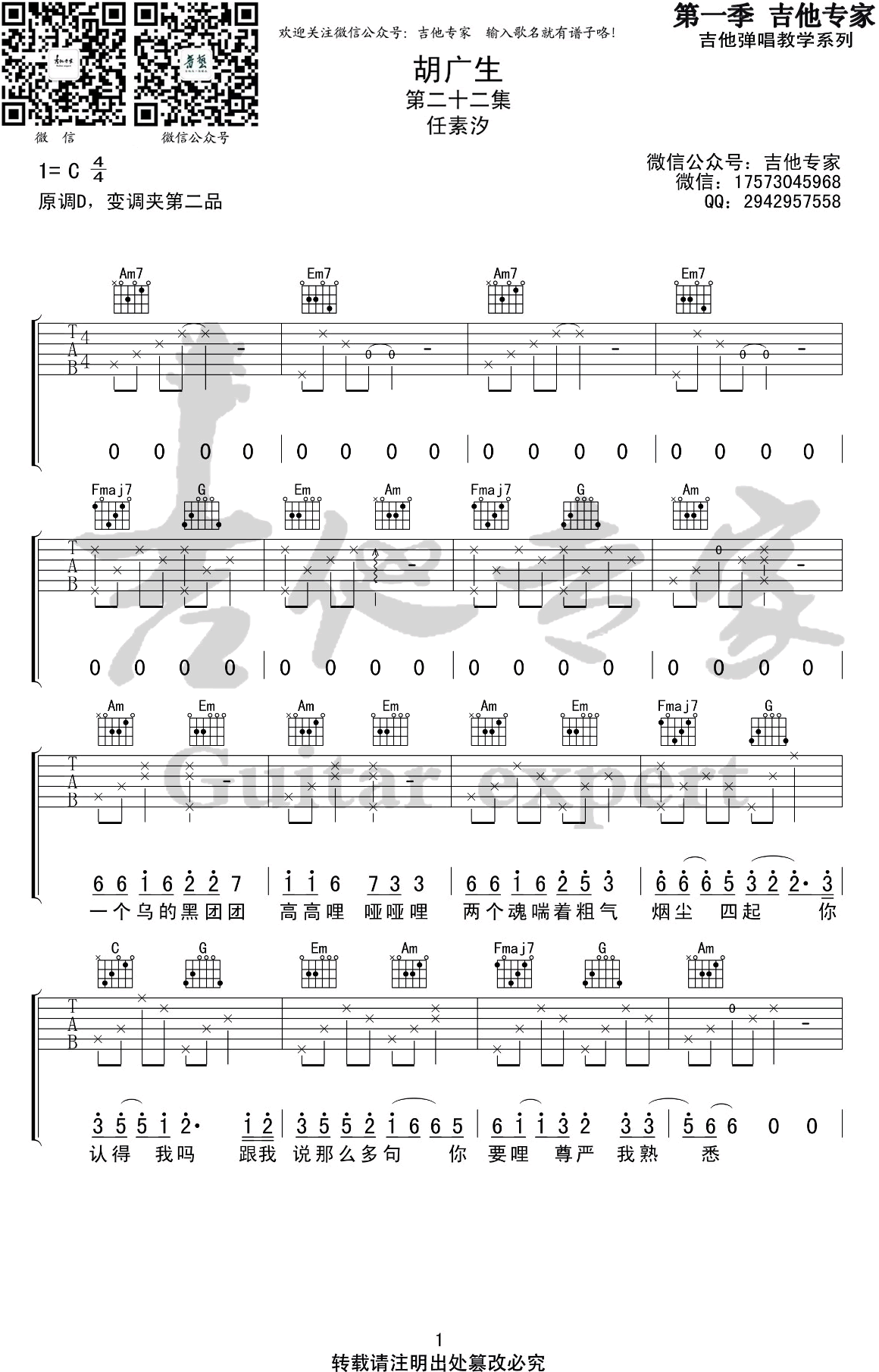 - 胡广生吉他谱 任素汐 C调 带原版前奏 演示视频