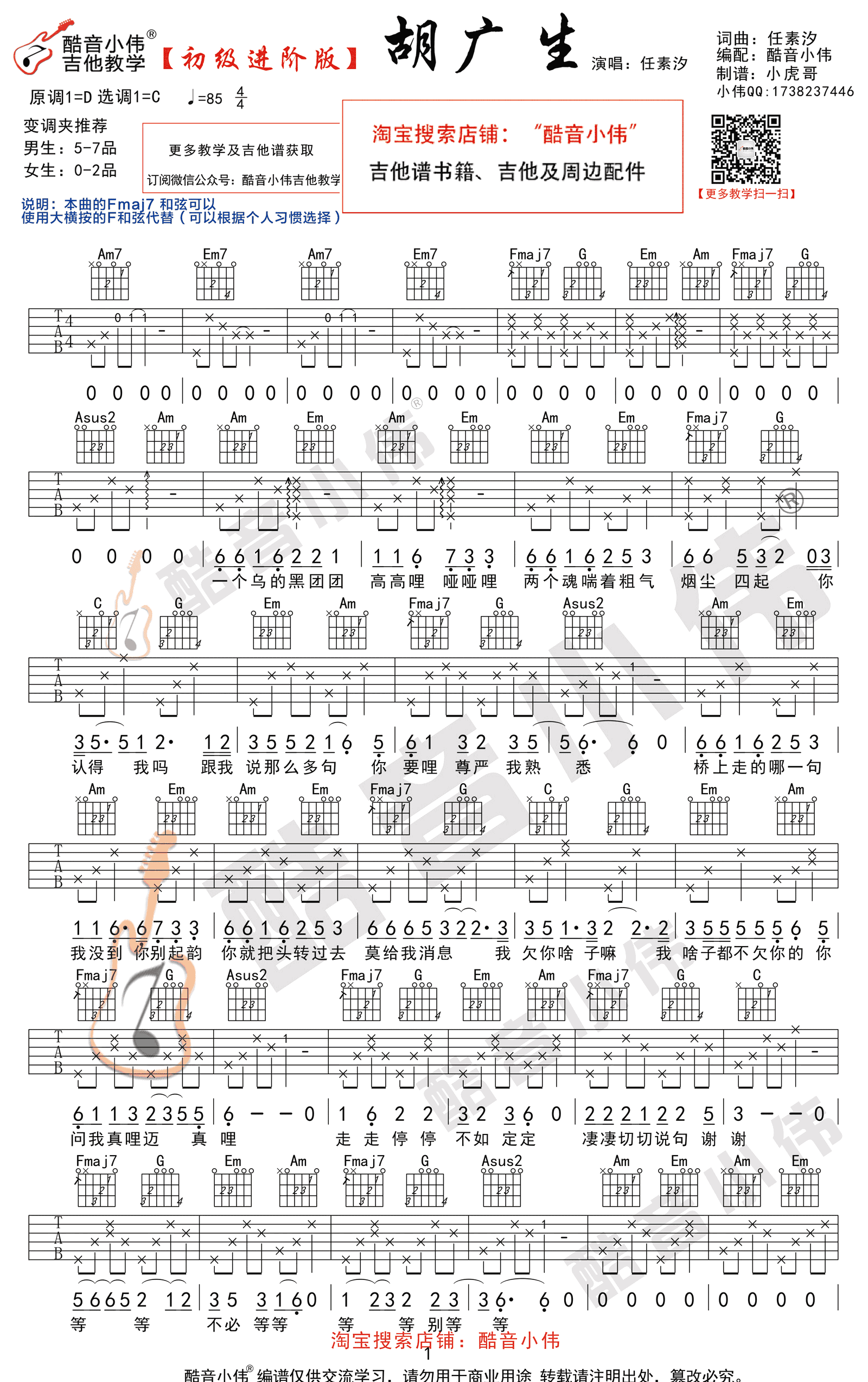 - 胡广生吉他谱 任素汐 C调 带原版前奏 演示视频
