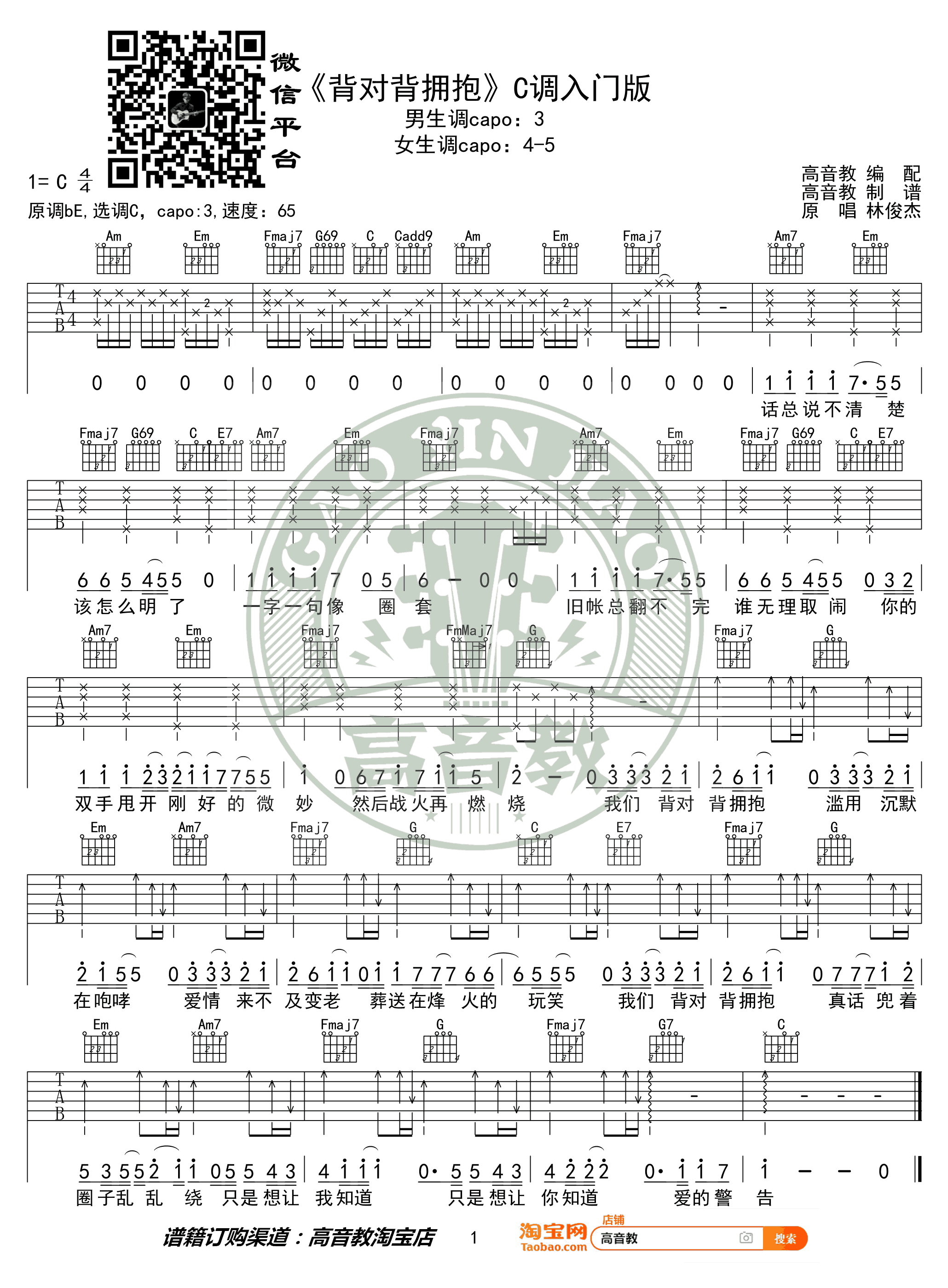- 背对背拥抱吉他谱 林俊杰 C调和弦弹唱谱
