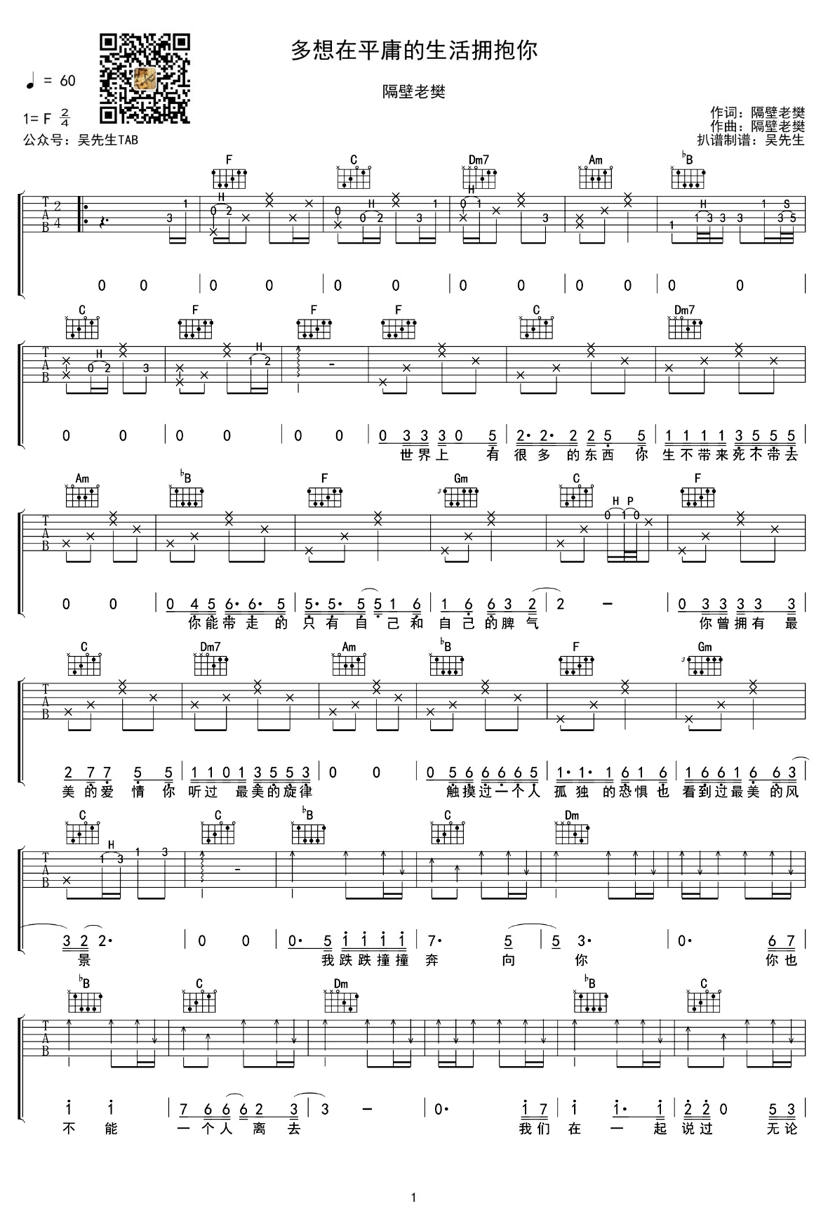 - 多想在平庸的生活拥抱你吉他谱 隔壁老樊 C调六线谱