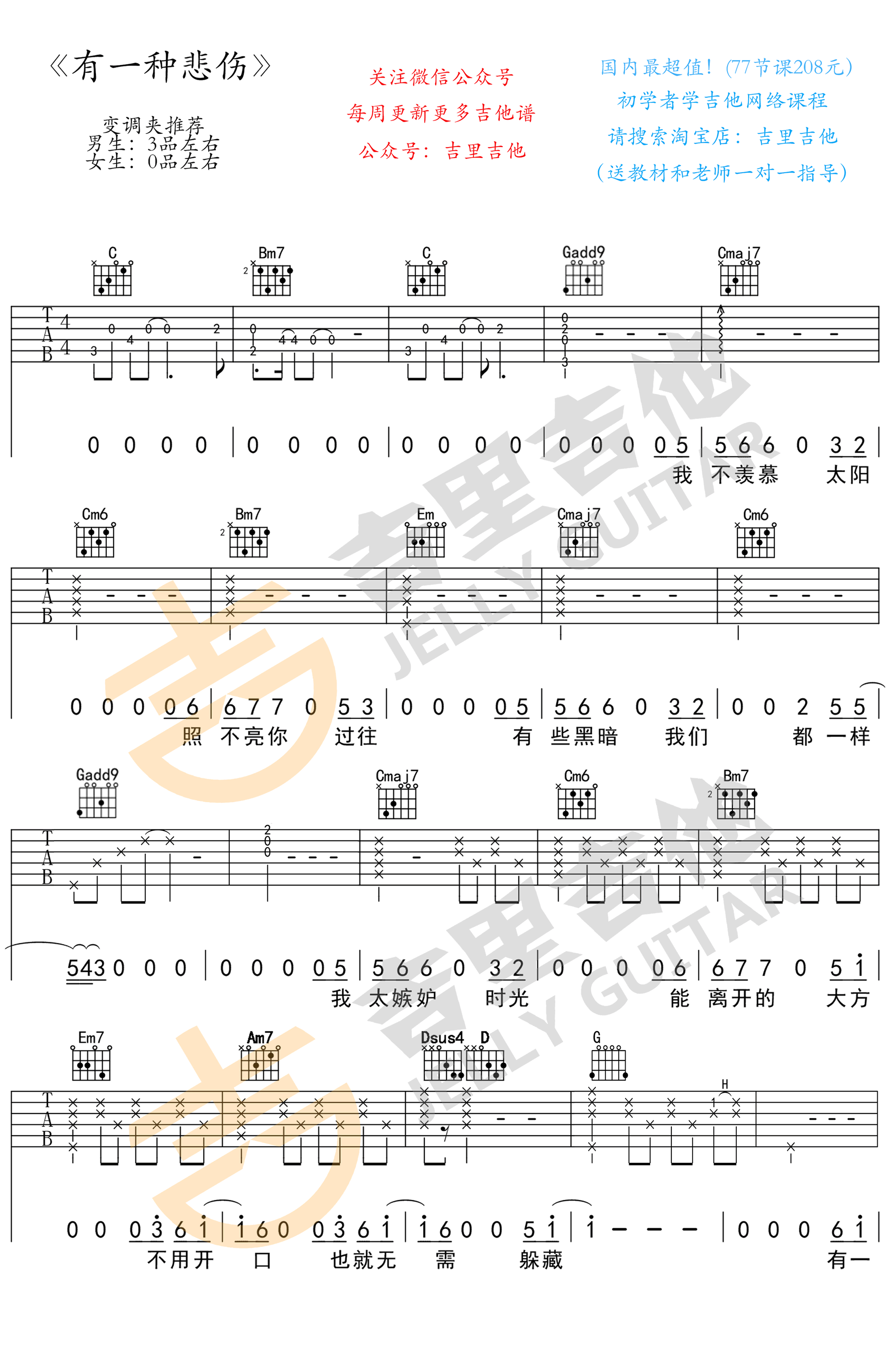 《有一种悲伤》吉他谱,A-Lin演唱《比悲伤更悲伤的故事》电影主题曲,刘以豪男生版,有一种悲伤六线谱,变调夹推荐,男生夹二品,女生不夹,吉里吉他编配,易唱网上传更新。随谱附上曲谱配套吉他弹唱演示视频,电影中男女之间爱而不得的情感交织,在曲中被诠释得淋漓尽致,散场后在脑海里反复循环,像在回味电影,其实是在听自己的过往。