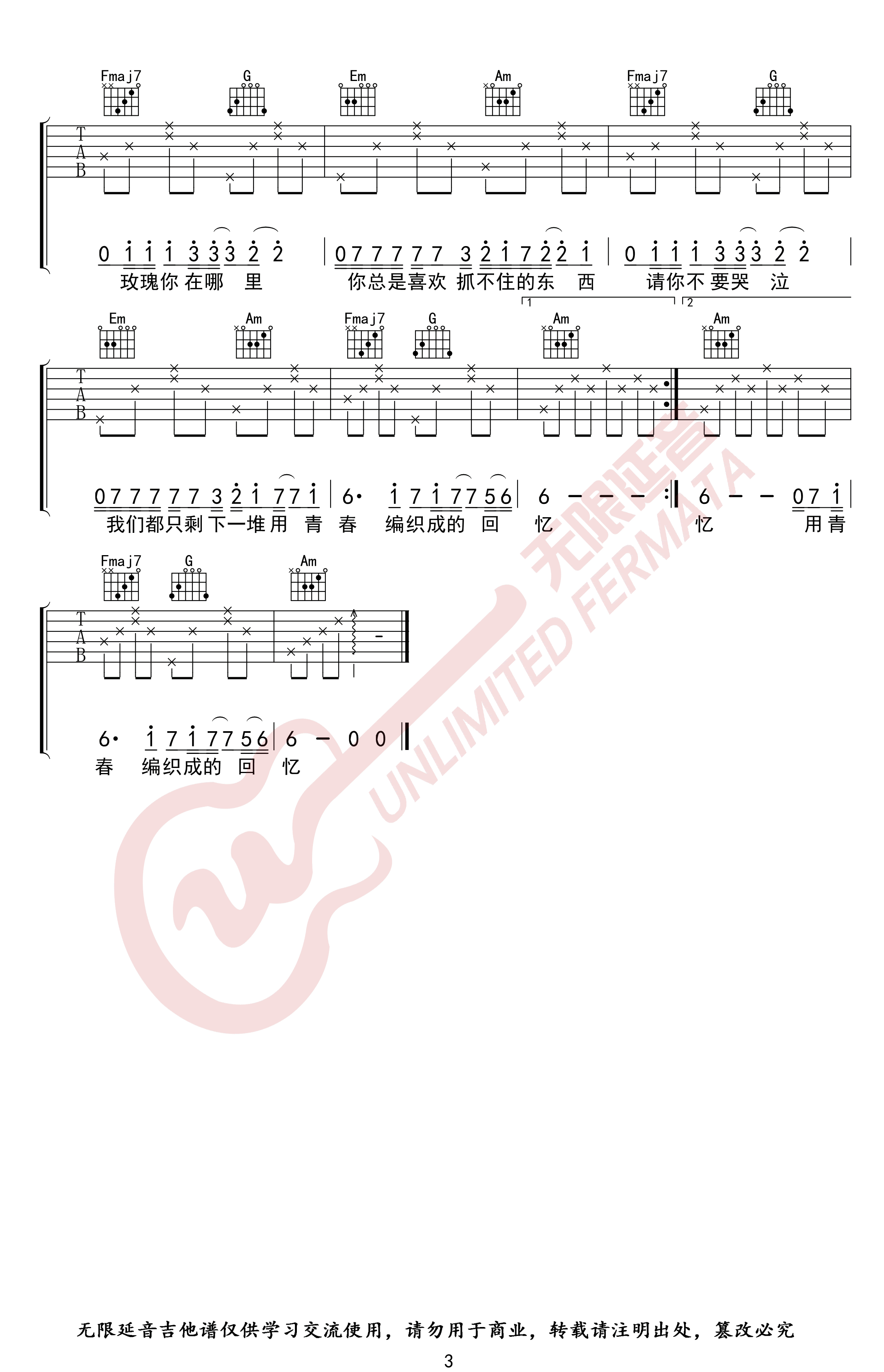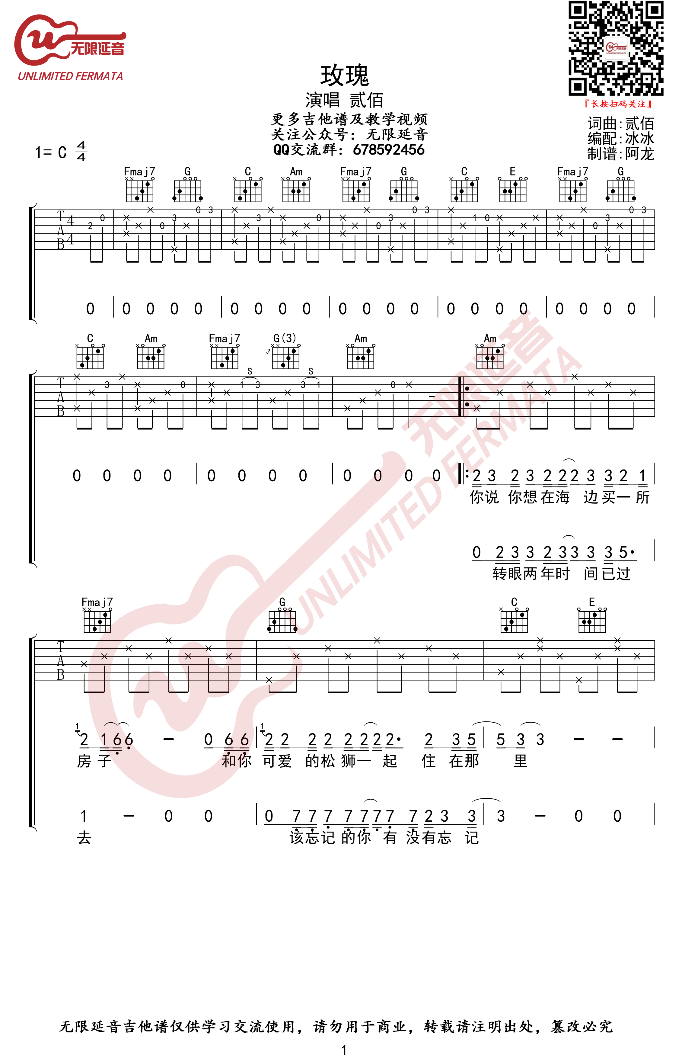 - 玫瑰吉他谱 贰佰 《玫瑰》六线谱 C调弹唱谱