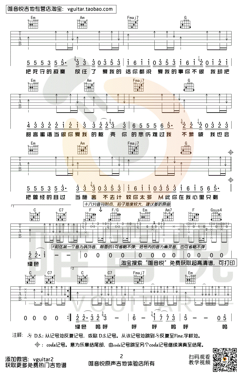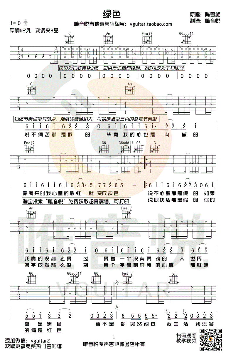 - 绿色吉他谱_C调弹唱谱_陈雪凝_高清图片谱