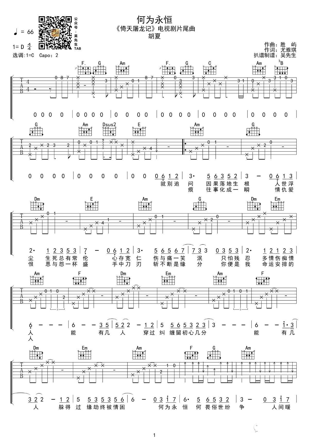 胡夏《何为永恒》吉他谱,新版电视剧《倚天屠龙记》片尾曲,何为永恒六线谱,原调D,选调C,Capo夹二品。高清图片谱,吴先生tab编配出品,易唱网上传分享。