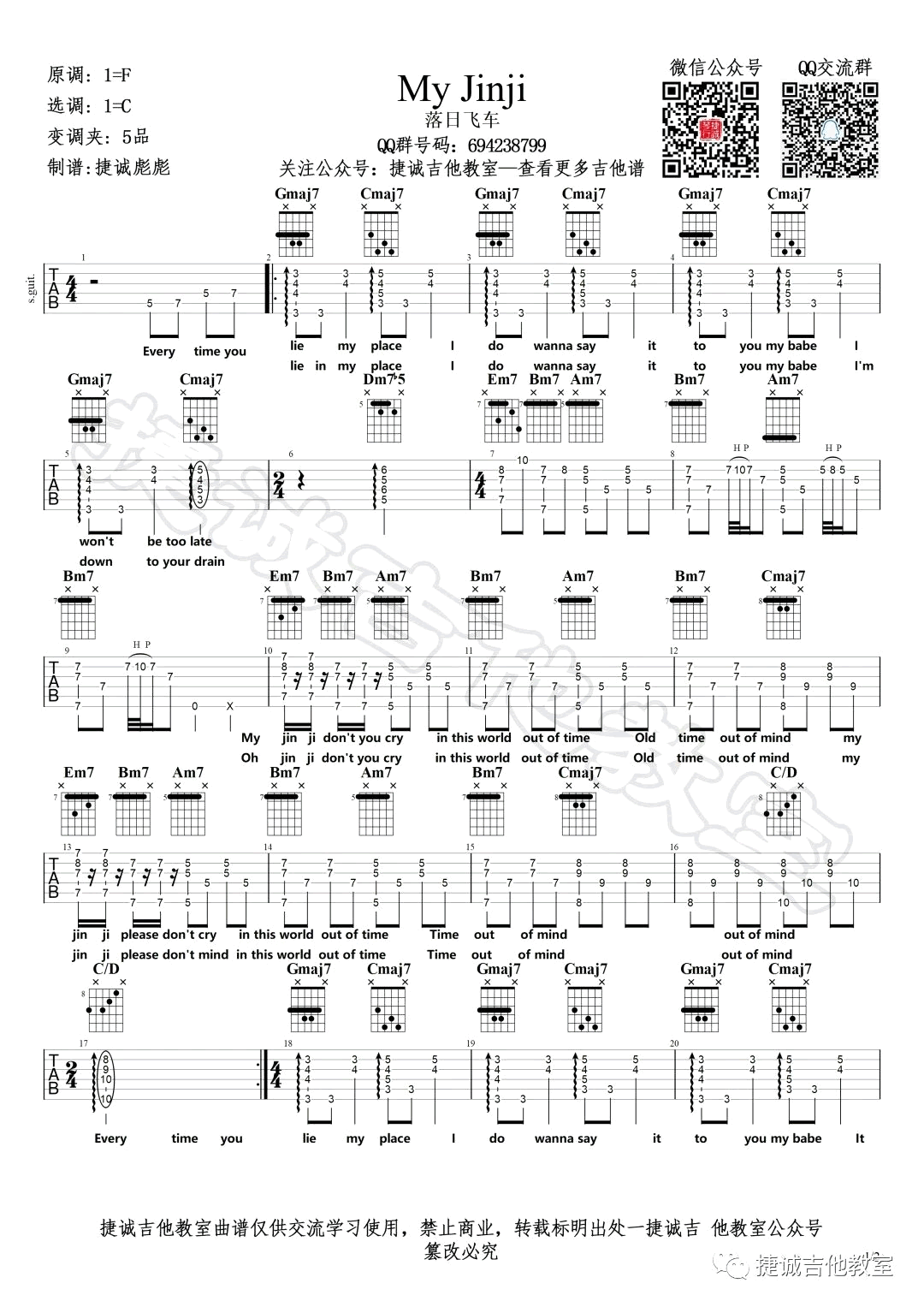 - My Jinji吉他谱_落日飞车_C调弹唱谱_吉他教学视频