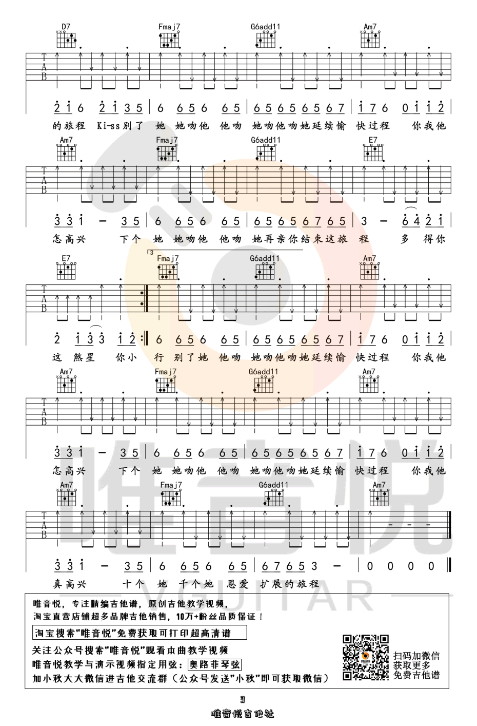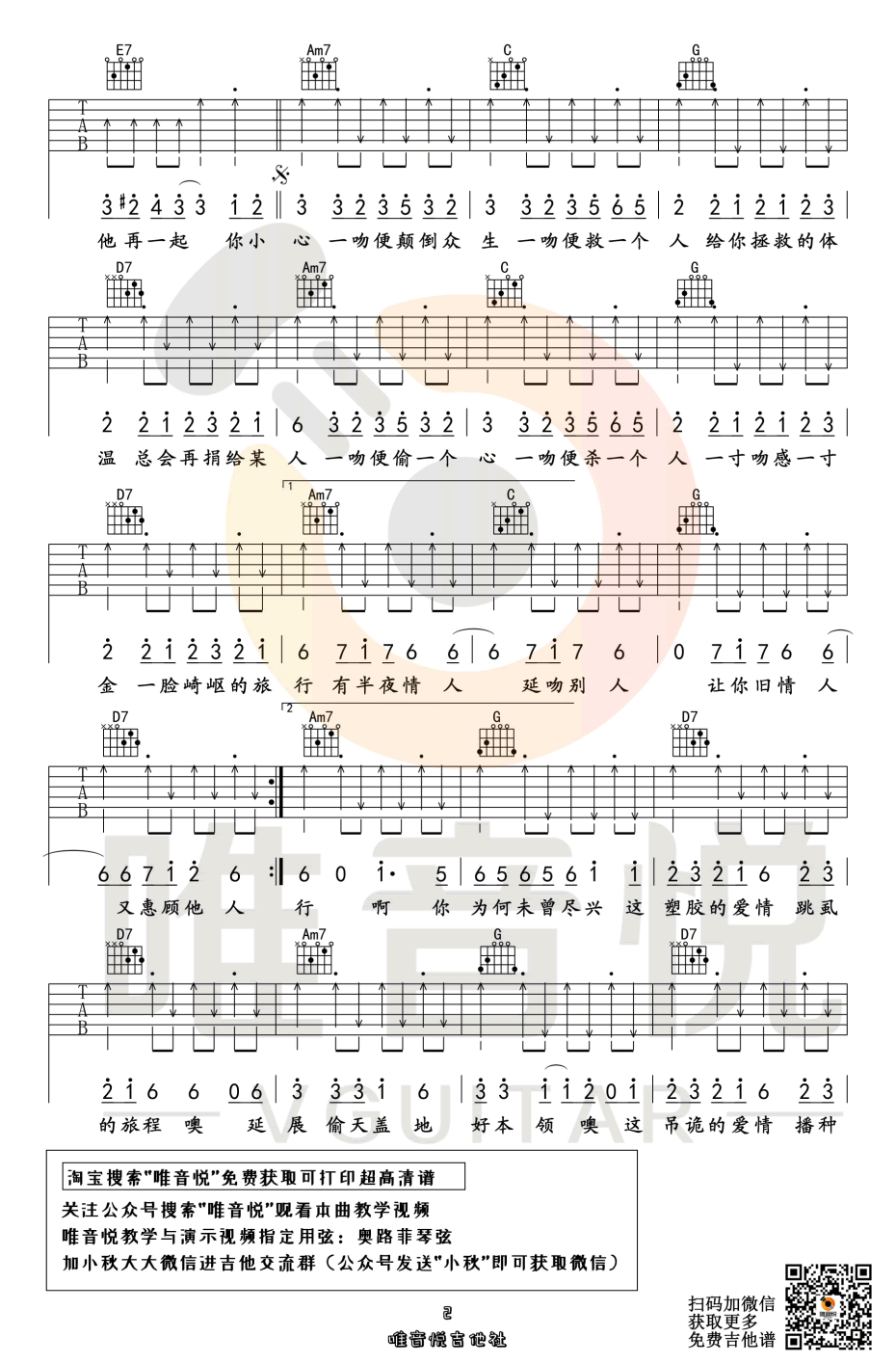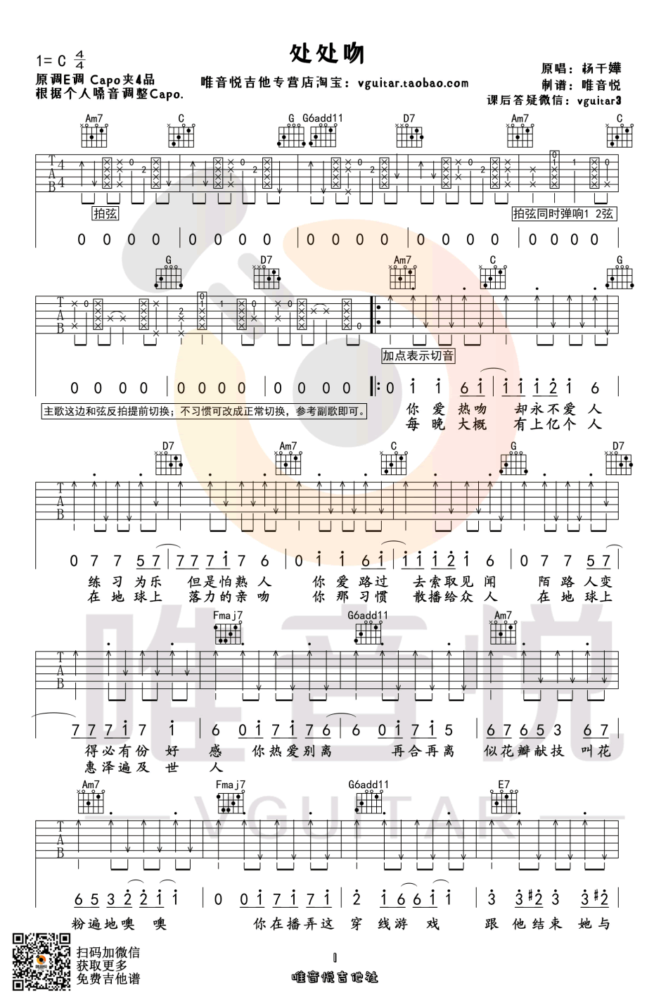杨千嬅《处处吻》吉他谱,原调E,capo夹四品,选用C调指法编配。一首经典粤语歌曲,处处吻六线谱,三张弹唱图片谱,唯音悦编配出品,易唱网上传更新。