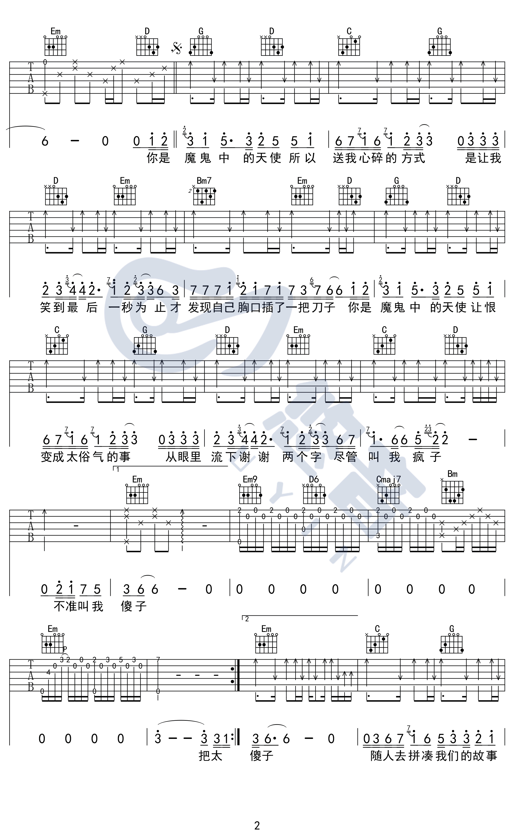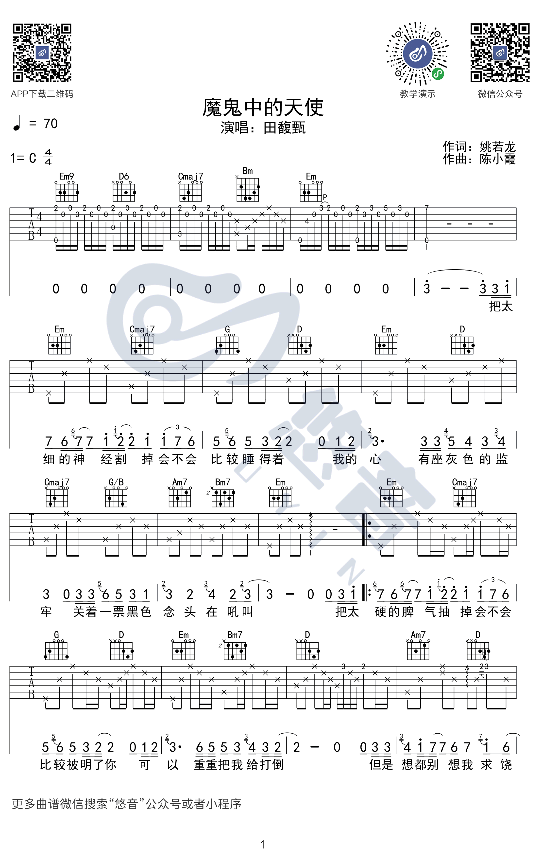- 魔鬼中的天使吉他谱 田馥甄 弹唱演示视频 高清图片谱
