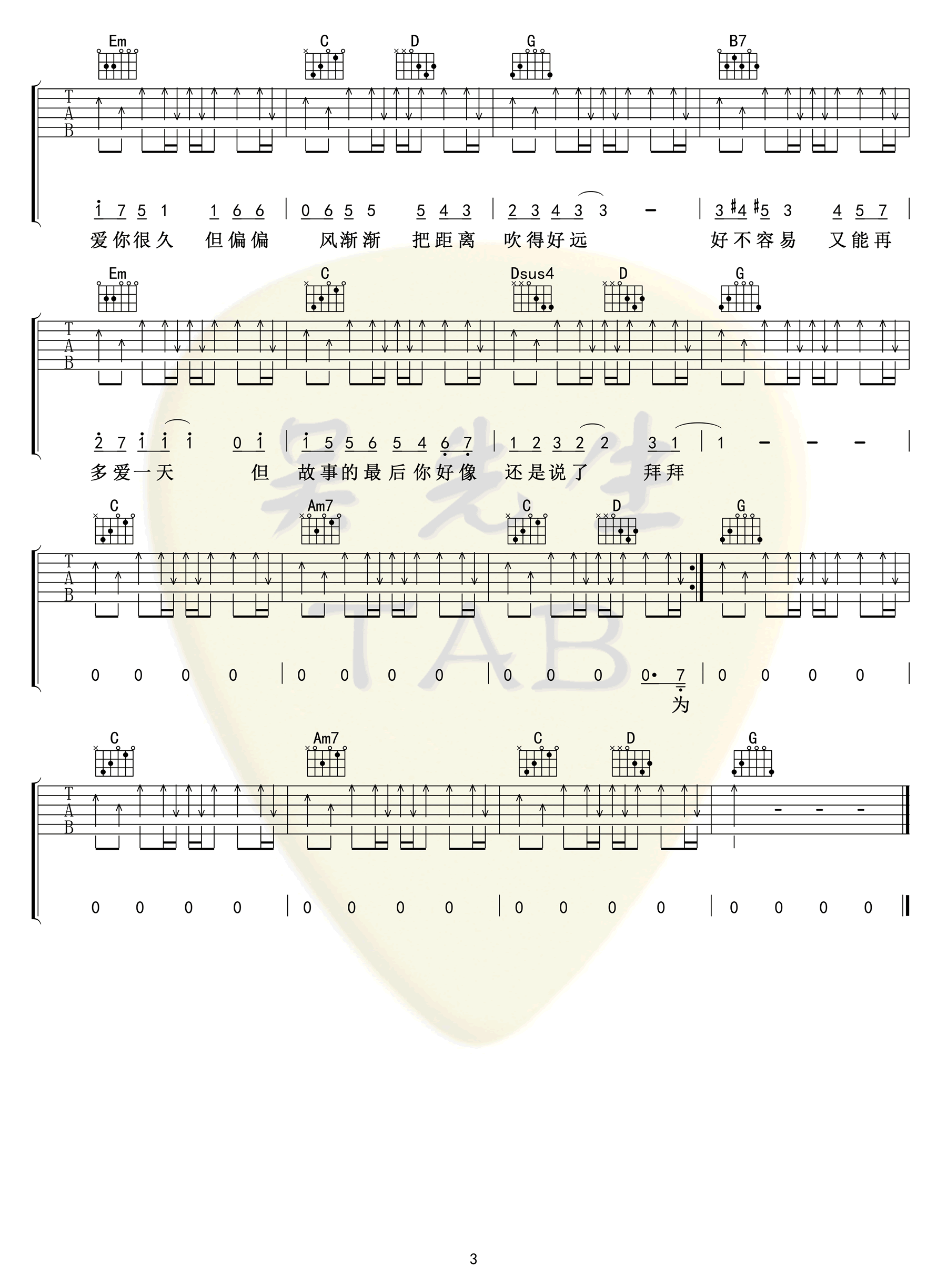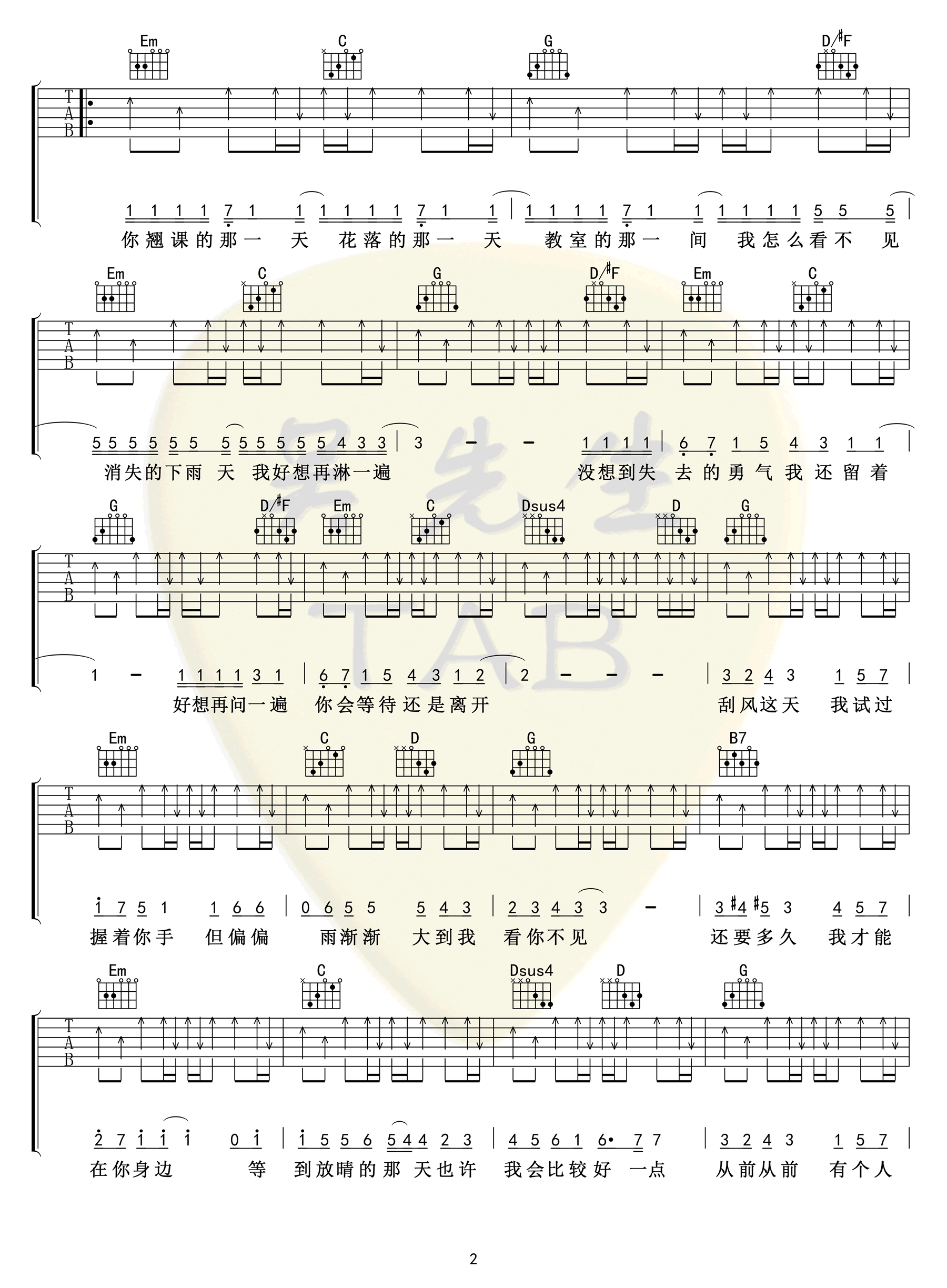 - 周杰伦《晴天》吉他谱_G调_弹唱六线谱