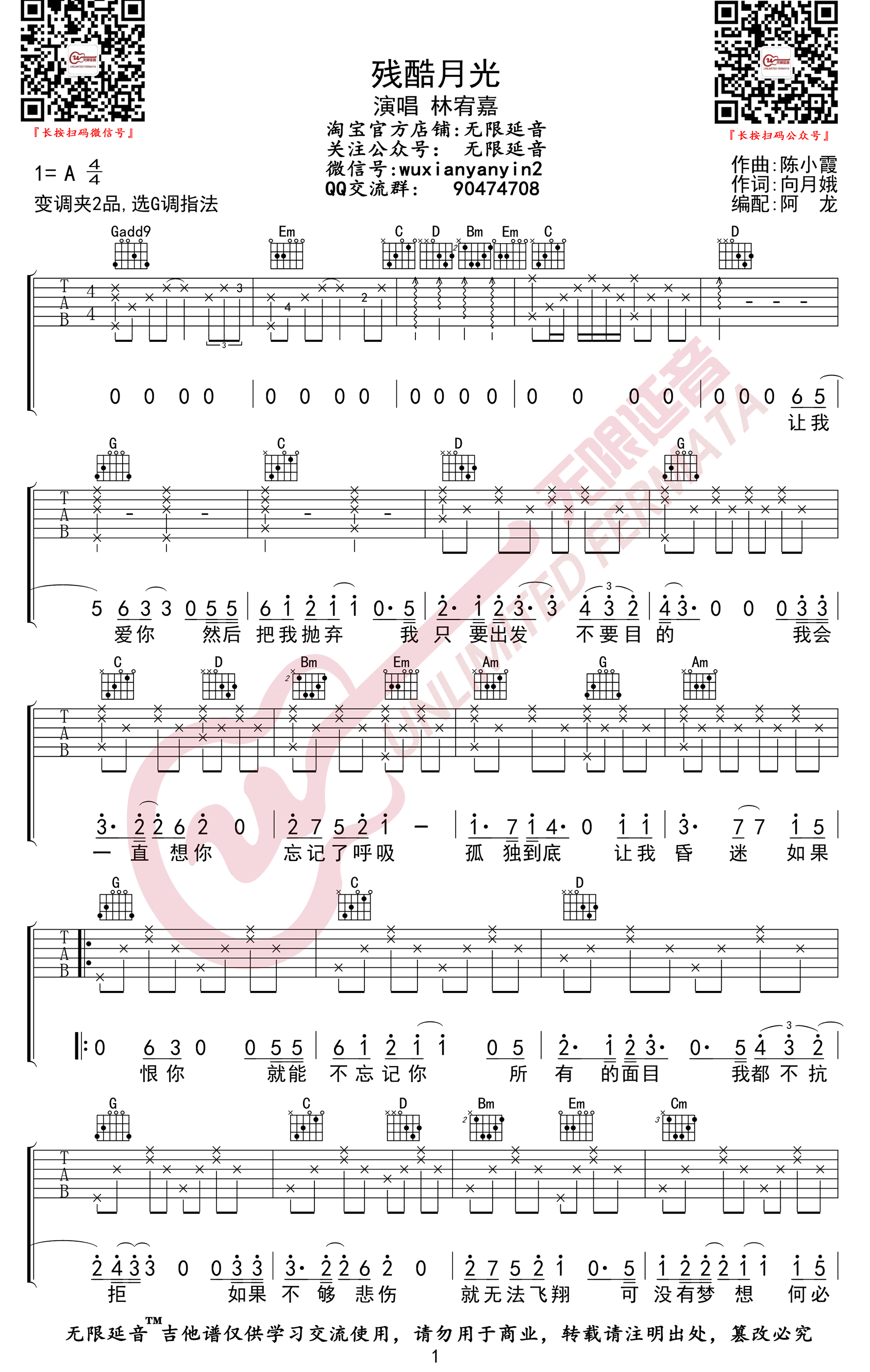 残酷月光吉他谱,林宥嘉演唱的一首经典情歌,残酷月光六线谱,G调指法,变调夹二品,两张弹唱图片谱,无限延音编配出品,易唱网上传分享。