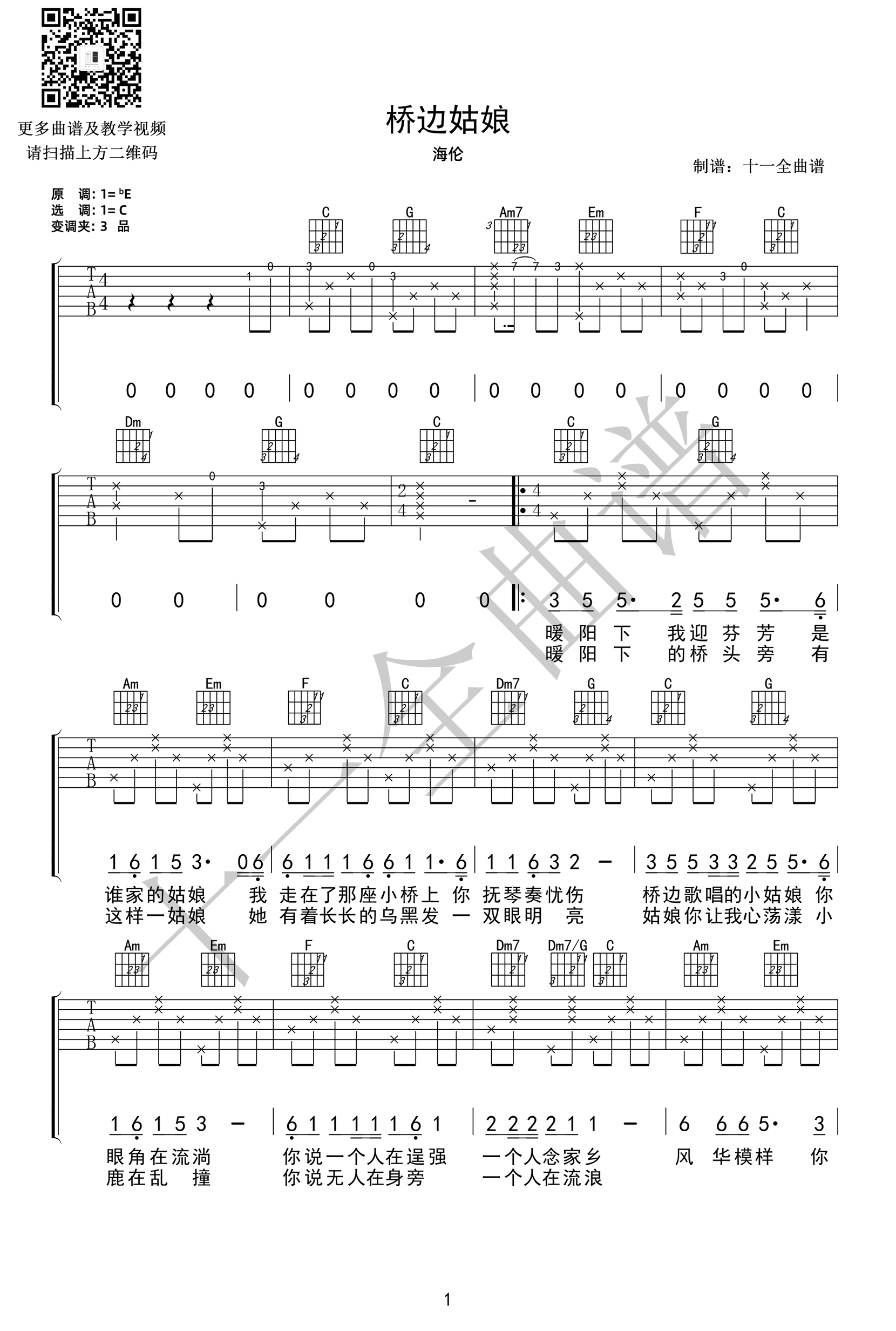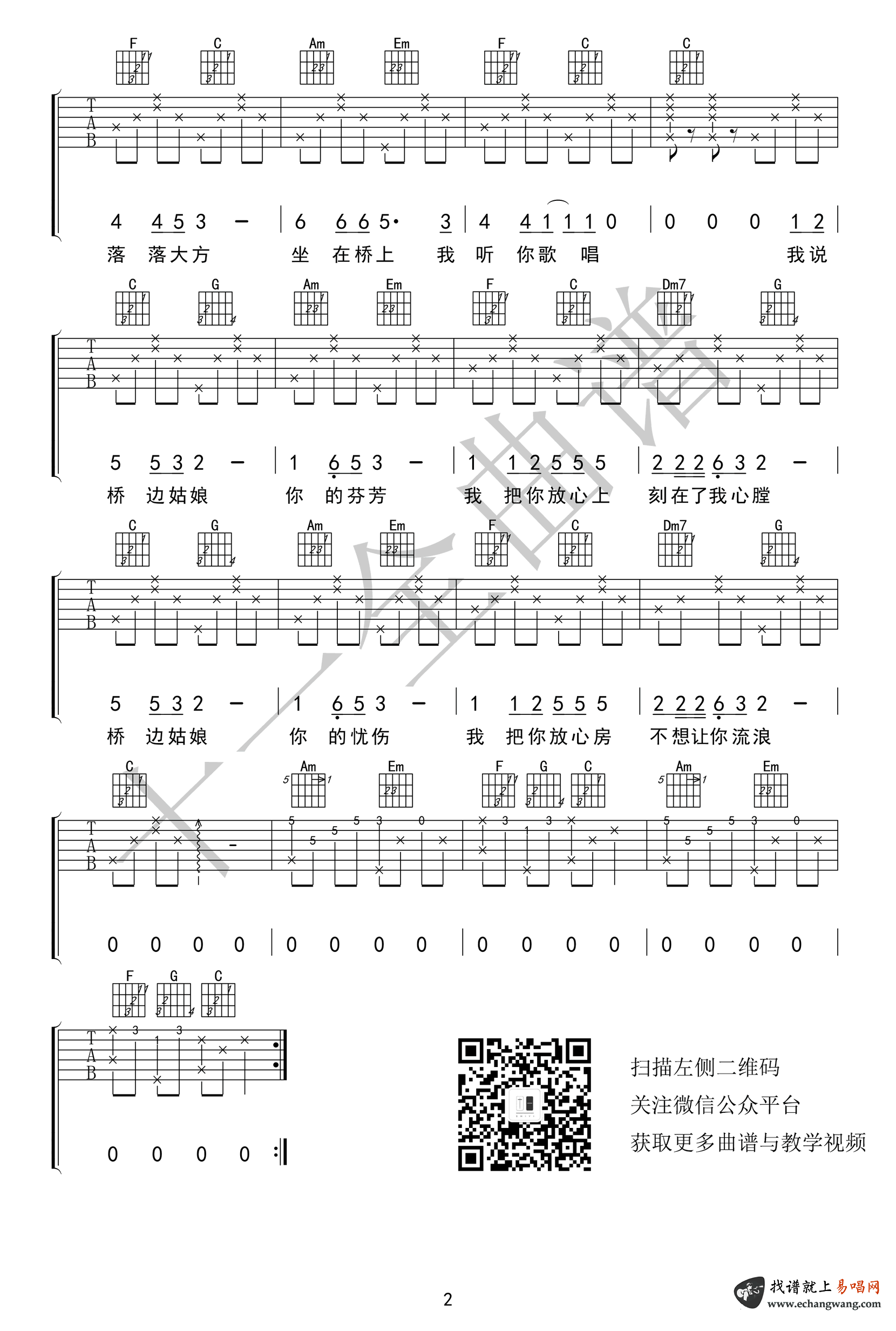 - 桥边姑娘吉他谱_海伦_C调弹唱谱_原版带前奏间奏