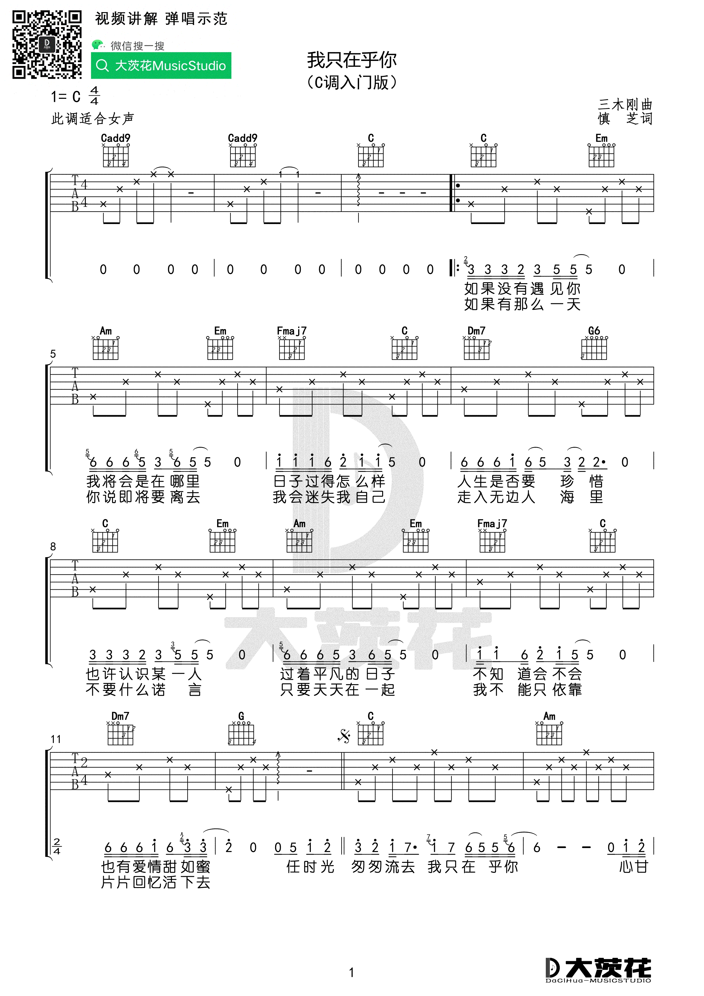 - 我只在乎你吉他谱_邓丽君_C调简单版_女生弹唱谱