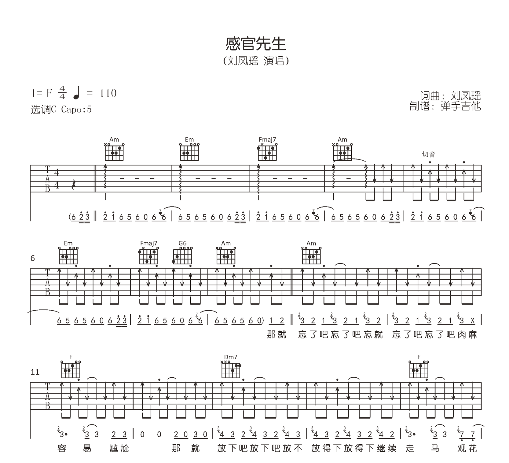 - 感官先生吉他谱_刘凤瑶_C调原版_弹唱六线谱