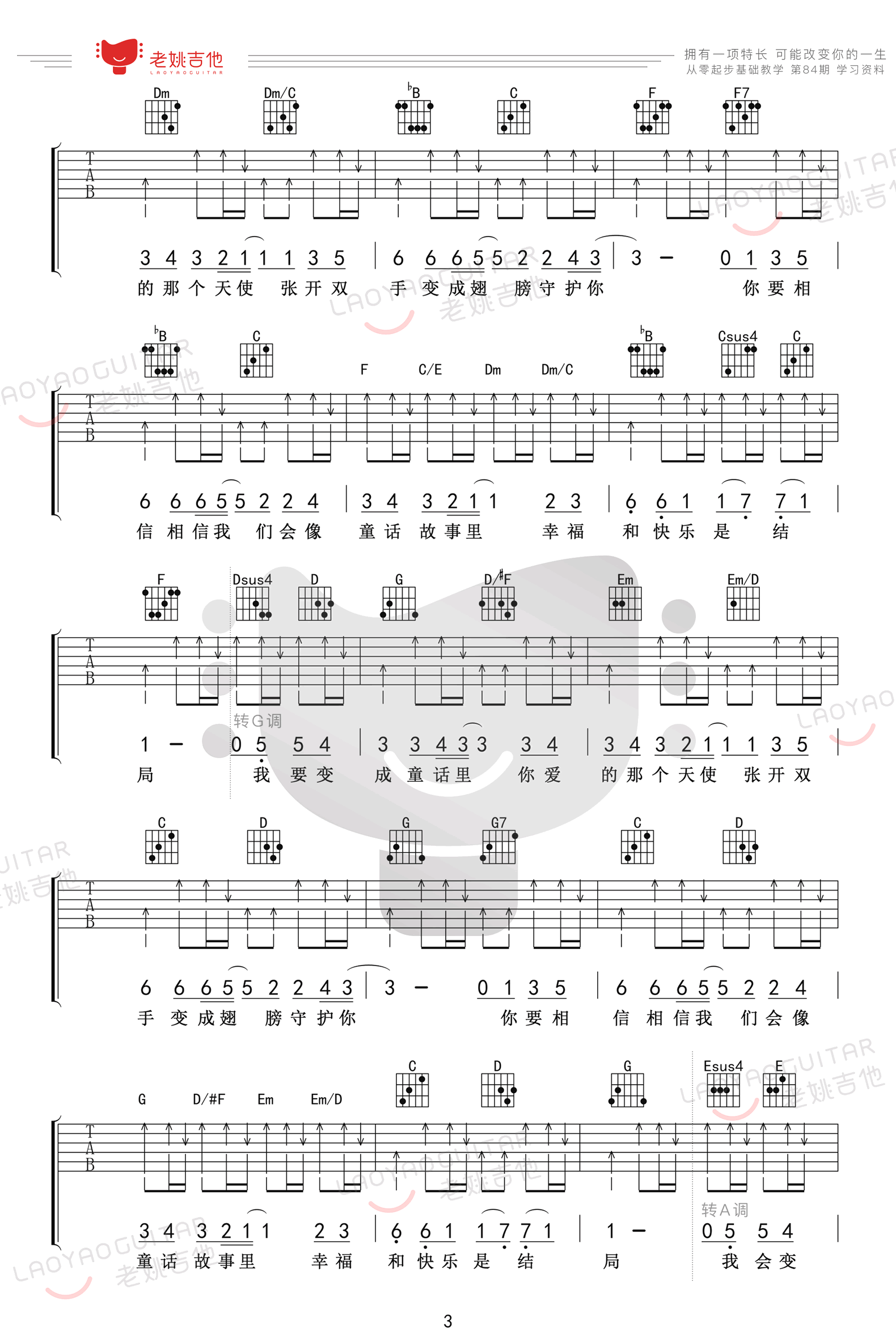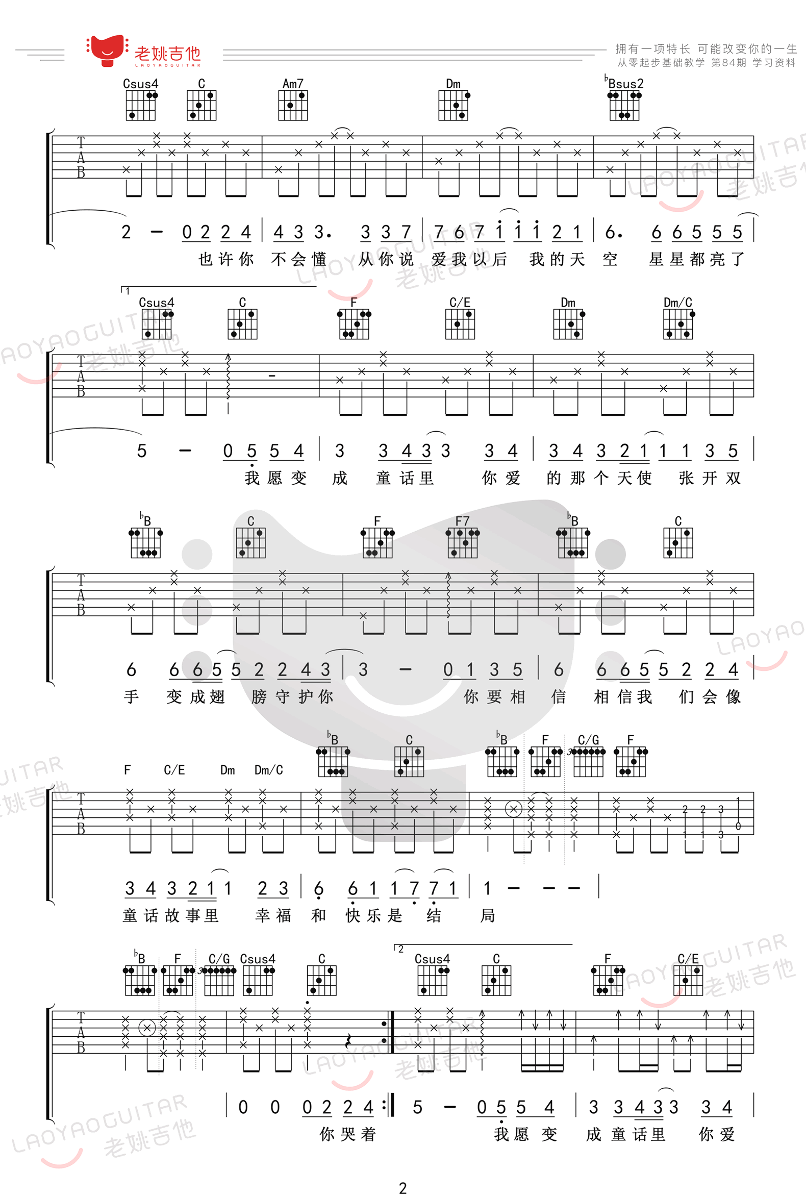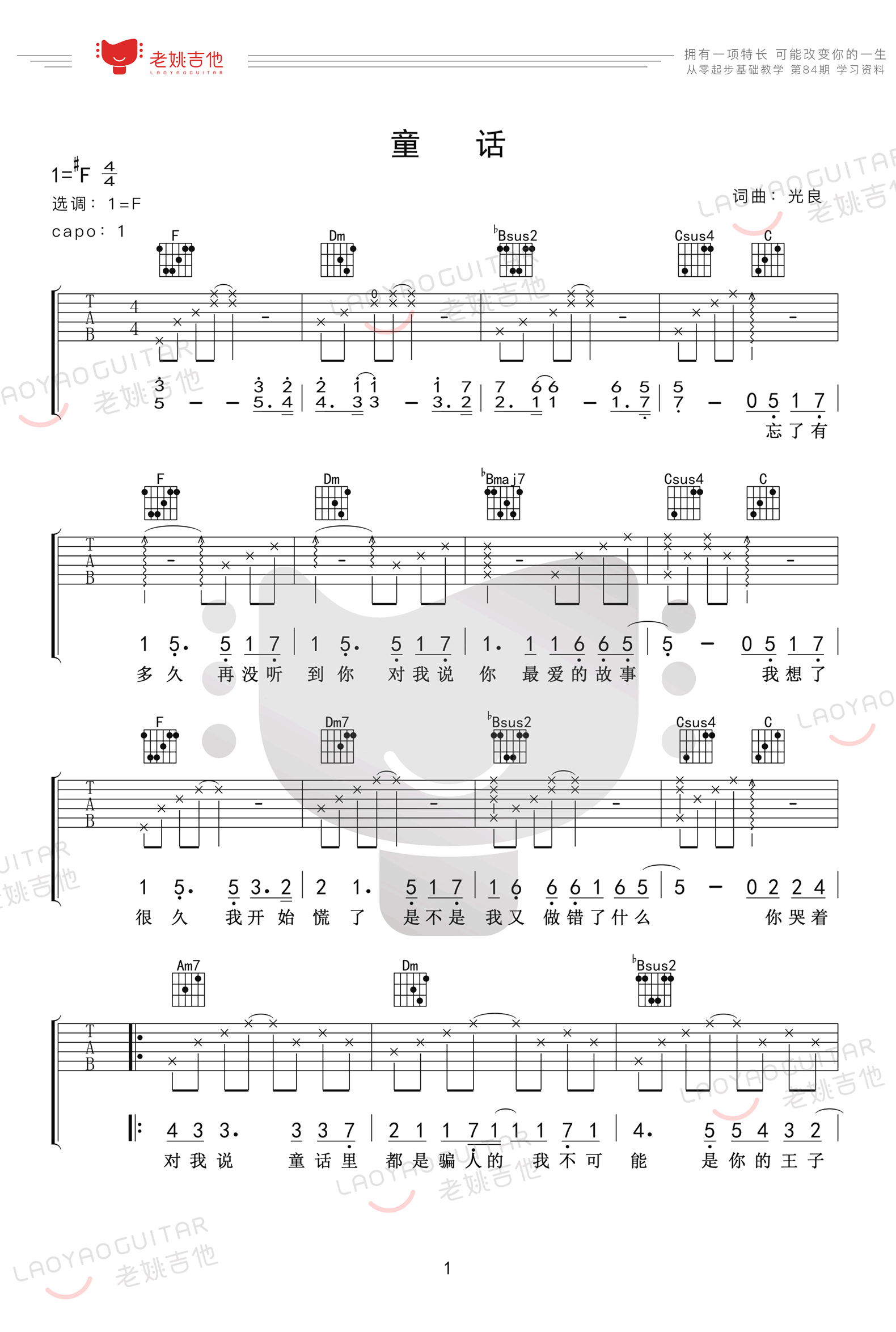 童话吉他谱,光良的一首经典代表作品,童话吉他六线谱,原调升F,选用F调指法编,变调夹一品,完整编配共四张高清图片谱。感谢老姚吉他出品,易唱网发布分享。随谱附上《童话》吉他弹唱教学视频,琴友们参照示范讲解练习,通过这首歌曲,琴友们学会掌握升调转换。