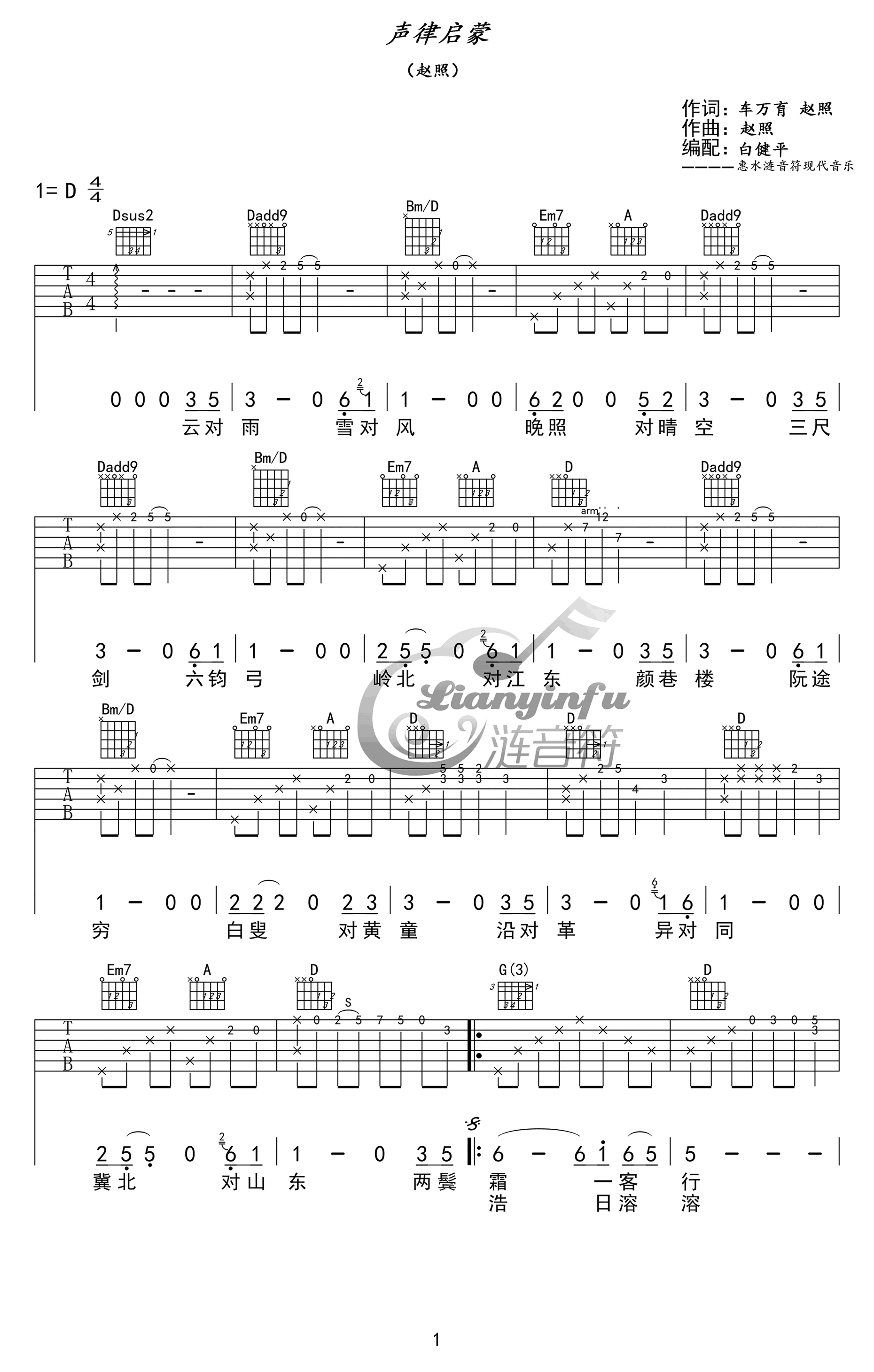 声律启蒙赵照吉他谱 经典咏流传易唱网声律启蒙吉他谱,赵照的一首古风民谣原创作品,声律启蒙吉他弹唱谱,六线谱高清图片版本,白健平编配,感谢关注易唱网。